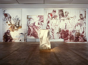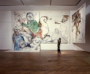 Erstmals sind im Künstlerhaus neben skulpturalen, graphischen und malerischen Werken Hrdlickas großformatigen Arbeiten für das Theater und die Oper zu sehen. Diese monumentalen Bühnenbilder, die für die Theater in Stuttgart und Bonn entstanden sind, werden in kompletter Größe präsentiert. Die Prospekte für Goethes "Faust" und Luigi Nonos Oper "Intolleranza 1960“ sind von immenser Wirkung ob der Kraft der figuralen Darstellung, die an die großen Freskenzyklen der Kunstgeschichte erinnert. In diesen riesigen, bis zu 9 x 15 Meter großen Bühnenbildern kommentiert der Künstler in figurenreichen Tableaux das dichterische Werk. Fern von Ausstattung und üblicher Bühnendekoration schafft Hrdlicka mit seinem Werk eine paralleles Schau-Spiel. Er erweitert den Anspruch der reinen schauspielerischen Wiedergabe des Werkes.