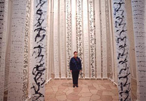 Die Wirkung von Leichtigkeit der Werke erzeugt innerhalb von Mauern eine Art Schweben, sie hängt sie auch auf Stangen oder baut daraus zelthafte, bezeichnete Behausungen mit Lampen im Inneren. Die andere Präsentation in der Natur ist zwar keine Land-Art – korrespondiert aber mit ihr, wie die Vorgangsweise parallel zum Tanz mit dem Aktionistischen. Energetischer Bewegungsfluss und Körpersprache zeichnen die einzelnen Figuren und Figurengruppen aus, das Tanzmoment und die bewusste Bewegung sind für sie ebenso wichtig wie soziale Komponenten innerhalb der Ausführung – so arbeitet sie z.B. auch mit Behinderten.