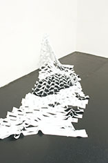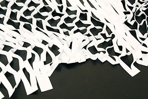 EXP ist eine Plastik, die mit einem Rechteck als Grundriss auskommt und eine Zeichnung, die ohne zeichnerisches Prinzip funktioniert. Strichführung und Linie treten in Form von geordneten Schnitten in Erscheinung. Das angewandte künstlerische Verfahren ist weder additiv noch subtraktiv und dennoch erfährt das weiße Trägermaterial durch die entstandenen Lücken in seiner Ausdehnung einschneidende Variabilität. Als Ergebnis medienreflexiven Denkens ist EXP Zwitterwesen und ein Phänomen des Überganges.
