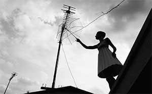 Als großformatige Fotografie ist „Silhouette“ von Birgit Graschopf im Außenraum der k/haus Passagegalerie affichiert, direkt im Gang zur U-Bahn. Birgit Graschops performative Inszenierung an ausgesuchten Plätzen in Tokio ist der Versuch einer Annäherung an den ihr fremden japanischen Kulturraum. „Als ich für das Foto “Silhouette” am Dach des Hauses stand und auch für die Arbeit “Halt!” auf der Straße lag, kam in beiden Fällen die Polizei.“ Birgit Graschopf trägt einen Rock aus gefalteten Papier, die Steifheit des Papiers unterstreicht ihr Fremdsein, erfüllt verschiedene Funktionen und visualisiert ihre persönliche Sichtweisen auf Japan. „Die Silhouette von mir im Papierrock ist im gleichnamigen Bild von Bedeutung, referiert auf den Papierschnitt (= jap. Katagami) und assoziiert den Scherenschnitt, der im Englischen “Silhouette” heißt. Sprichwörtlich “ausgerüstet” mit dem Rock und dem Schirm stehe ich am Dach des Atelierhauses in Tokio. Der Schirm erscheint im Bild als eine Art persönliche Antenne mit der ich versuche, Kontakt aufzunehmen. Ob das funktioniert bleibt offen für den Betrachter, mein durch die Steifigkeit des Papierrocks und durch die Pose starres Erscheinungsbild, das wiederum japanische Umgangsformen mit Gaijins (= Fremden) visualisiert, untergräbt meine Absicht der Kontaktaufnahme, aber unterstreicht die Beharrlichkeit.“