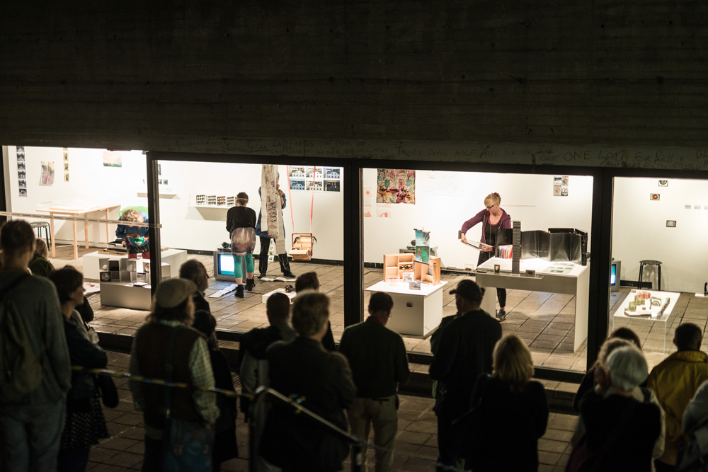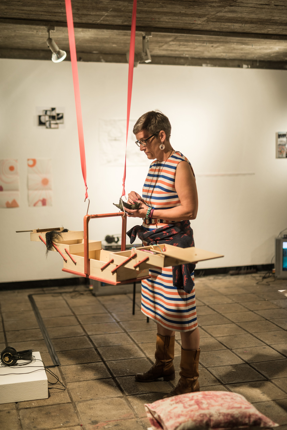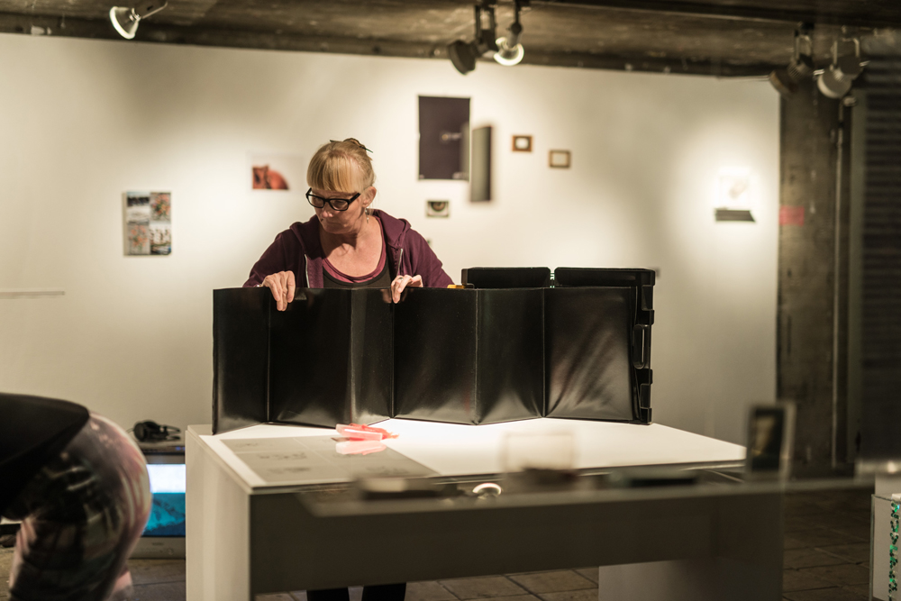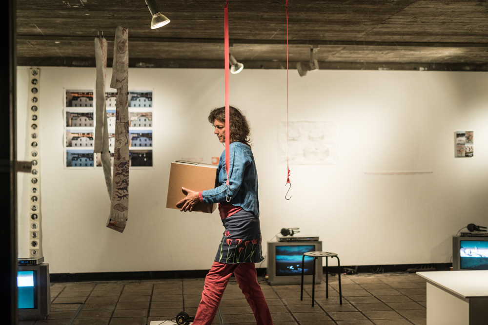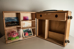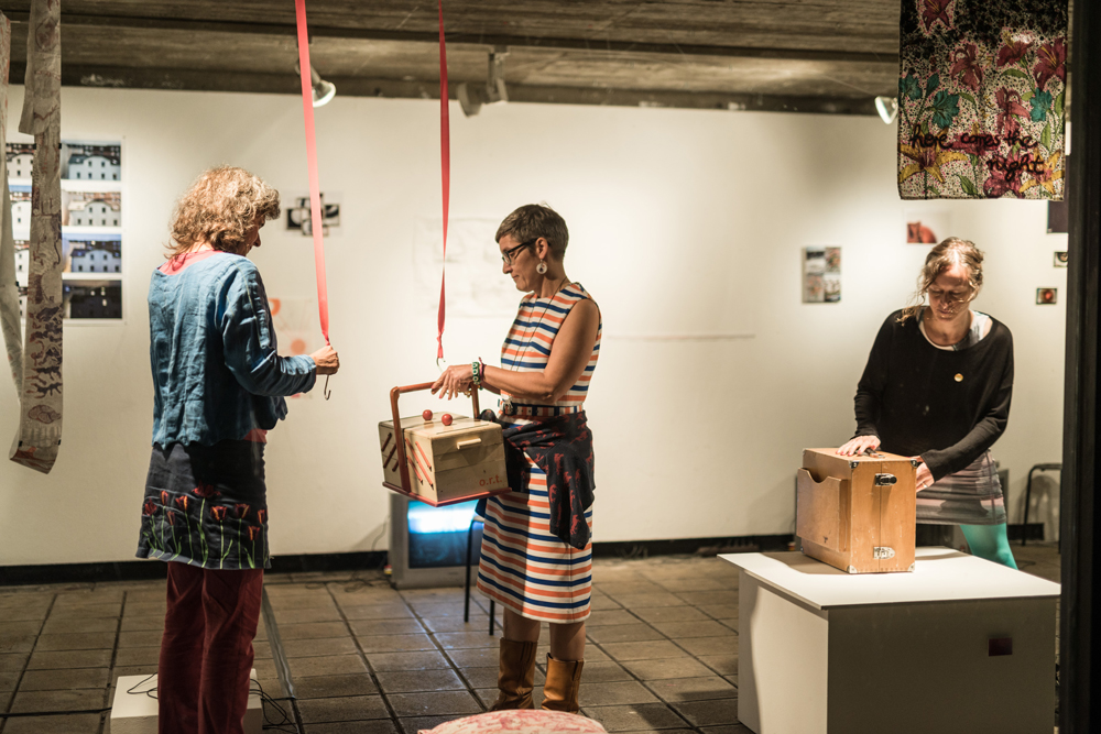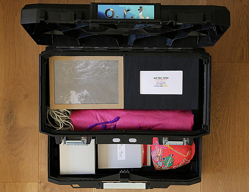Spektrum reicht vom Nähkästchen über den Pilotenkoffer bis zur selbstgebauten Schachtel. Und jede von uns kuratiert ihre Werkbox thematisch, wofür sie eine kuratorische Einladung mit ihren Wünschen, Informationen, Maßangaben usw. formuliert und losgeschickt hat. Die Werkboxen sind unser Handgepäck, das für Interessierte gerne geöffnet wird.