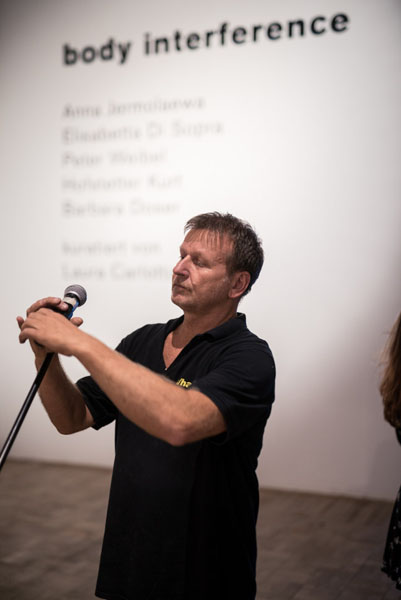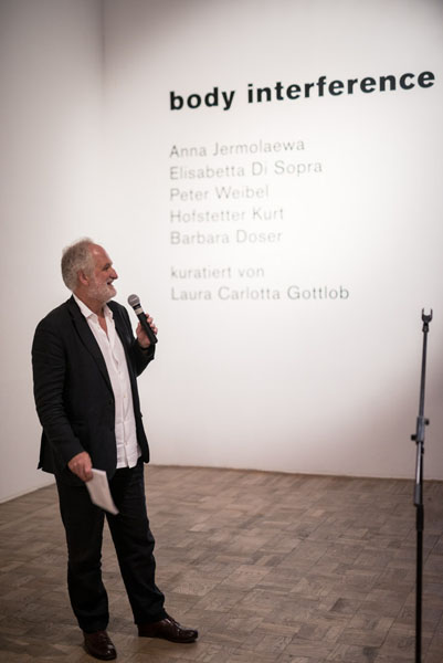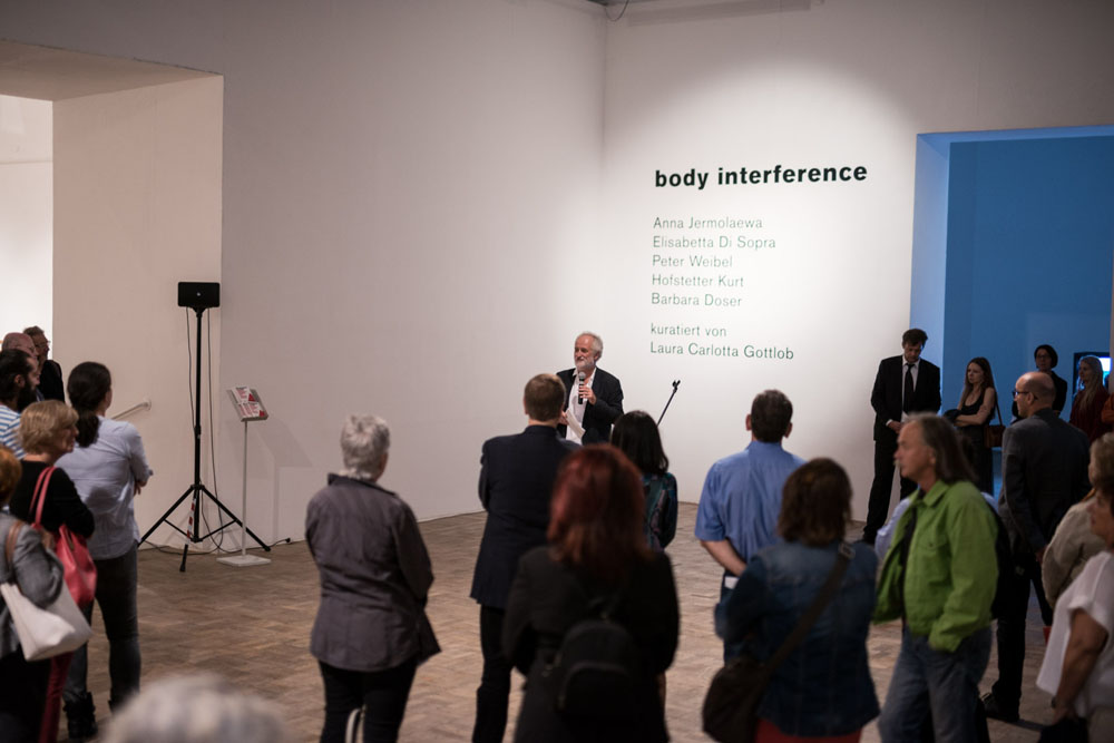 body interference, kuratiert von Laura Carlotta Gottlob, ist Teil des internationalen Projekts ”the body series”, das 2013 mit einer Ausstellung im St. John’s College (Oxford/UK) begann. Die Ausstellung zeigt fünf Werke von Künstlern, die mit der Sprache des Video die Grenzen des Körpers in seiner Beziehung zur Welt erforschen. Gemeinsam ist den gezeigten Werken, dass sie das Bild des Körpers als ein Mittel zur Vermittlung verstehen: zwischen Individuum und Macht (Anna Jermolaewa), zwischen Indiviuum und