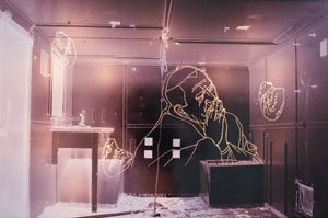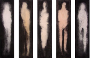 Gerlinde Thuma zeigt lebensgroße figurative Arbeiten. "Aus einem dunklen Bildraum treten scheinbar Figuren hervor, die sich einzig durch ihre diffusen Umrisse konstituieren. Die Künstlerin führt uns quasi hinters Licht, spielt mit Prozessen individueller Informations- und Perzeptionsverarbeitung und lässt auf diesem Weg Vorstellungsbilder von wahrgenommenen Teilaspekten der nur durch Licht sichtbar werdenden Wirklichkeit entstehen." (Hartwig Knack)