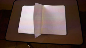Hubert Sielecki zeigt eine Buchinstallation. Dabei wird auf ein aufgeschlagenes, unbeschriebenes Buch ein zweites Buch projiziert. Man sieht, dass sich die Seiten des Buches umblättern, obwohl sich nur die digitalen Seiten bewegen. Die Suche, das Verlorene, das Ungesagte, das, was da ist, aber doch nicht, die Abwesenheit werden greifbar. Die Wirklichkeit verschwimmt mit der Fiktion.