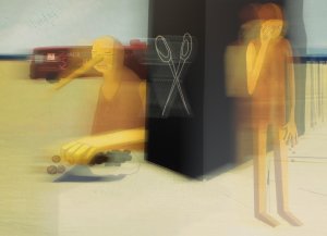Von Pika Nagy Árpád sieht man mit Wachs gefertigte Relievs. Sie täuschen die dritte Dimension nur vor. Die Wahl seines Materials unterstreicht die Körperhaftigkeit seiner Figuren. Ihn interessiert die Nachahmung als Zerrbild. (Pika)