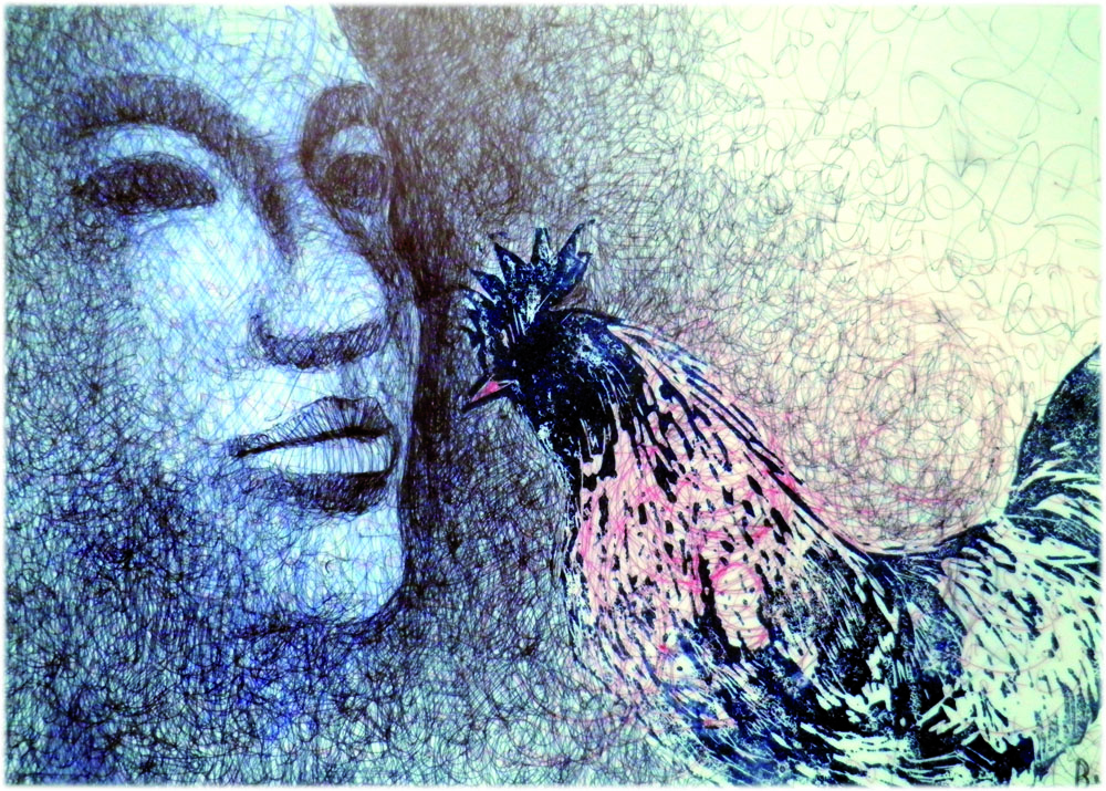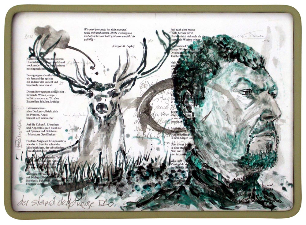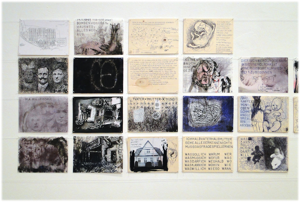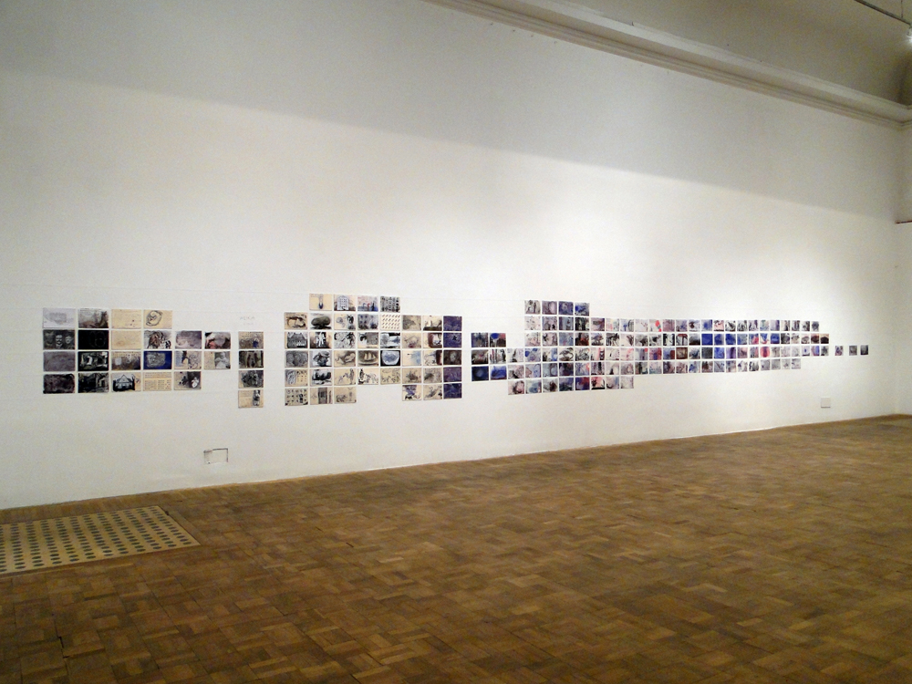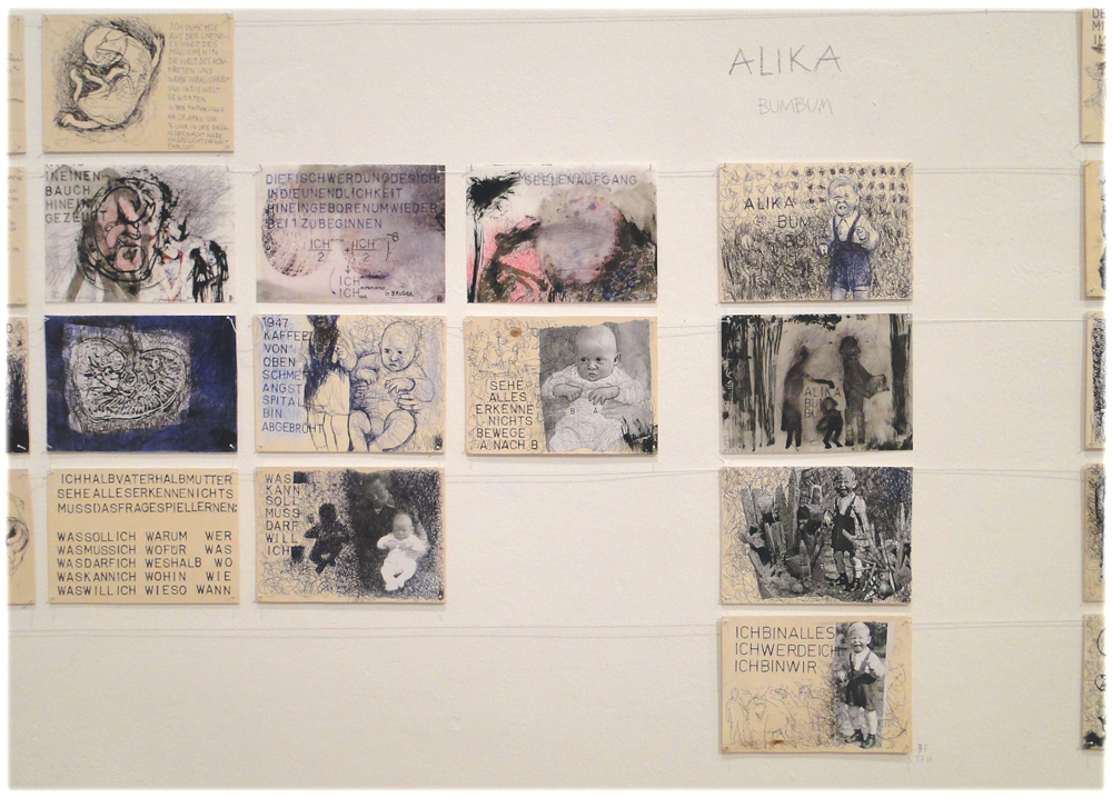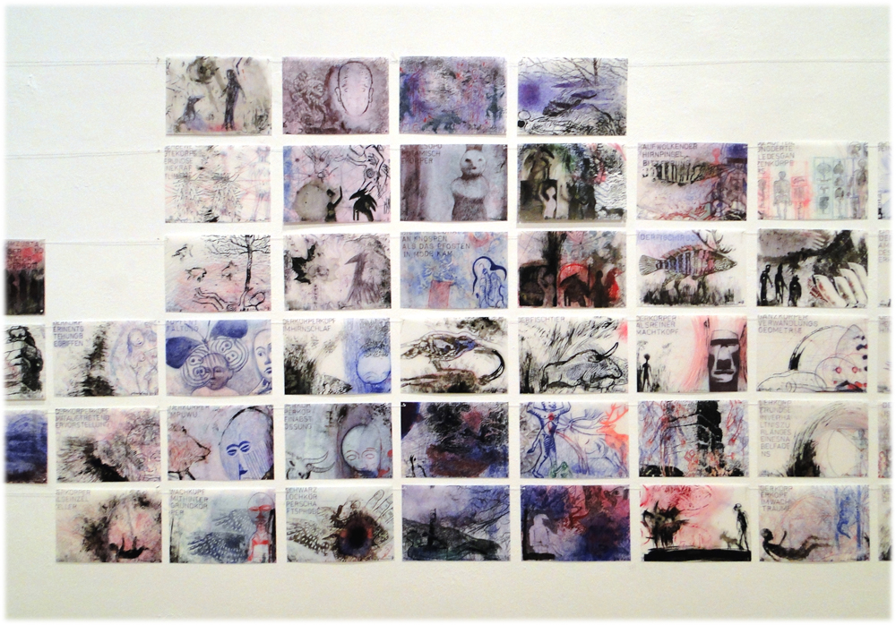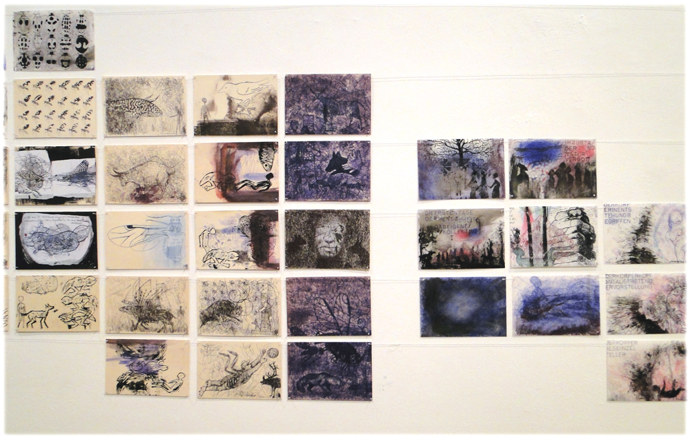 144 Zeichnungen mit Tusche und Kugelschreiber auf PVC- Zeichenfolie im Format A4. Das Projekt besteht aus drei übergreifenden Themenfeldern: 1. Erste Lebensjahre = Ohne eigene Erinnerung, 2. Die ersten Tage der Menschheit und 3. Der Körper und sein Verhältnis zur Geistseele = Das Eigene/Kollektive