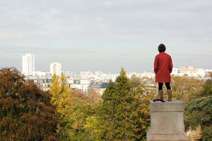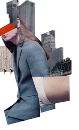 Anne Feldkamp: “Die Collage ‘Ohne Titel’ (2012) zeigt Versatzstücke der Skyline New York aus der Perspektive des Central Parks, davor ein Model aus einem Jil Sander-Advertorial einer Illustrierten. Das New Yorker Wolkenkratzer-Panorama, ein beliebtes touristisches Motiv, wurde teilweise neu zusammengefügt, zu sehen ist nunmehr eine quasi phantastische Hochhaus-Silhouette. Die Spanplatten sind wie die ausgerissenen Motive aus Kunst- und Modemagazinen ein völlig wertloses Material, das mir genau deshalb so reizvoll erscheint.”