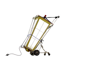 Markus Hiesleitner: “In vielen meiner Arbeiten beschäftige ich mich mit künstlichem Licht. Das künstliche Licht ist für den Menschen Orientierungshilfe, gibt Sicherheit und kultiviert den Tagesablauf. Eine ausgediente Parklampe aus dem Türkenschanzpark/Wien ist mit Spanngurten auf einer einfachen Transporthilfe befestigt. Ein Wurfkabel verbindet die Lampe mit dem Strom und erlaubt es, die Lampe mit sich zu führen.” Das Resultat ist die Installation: Ohne Titel