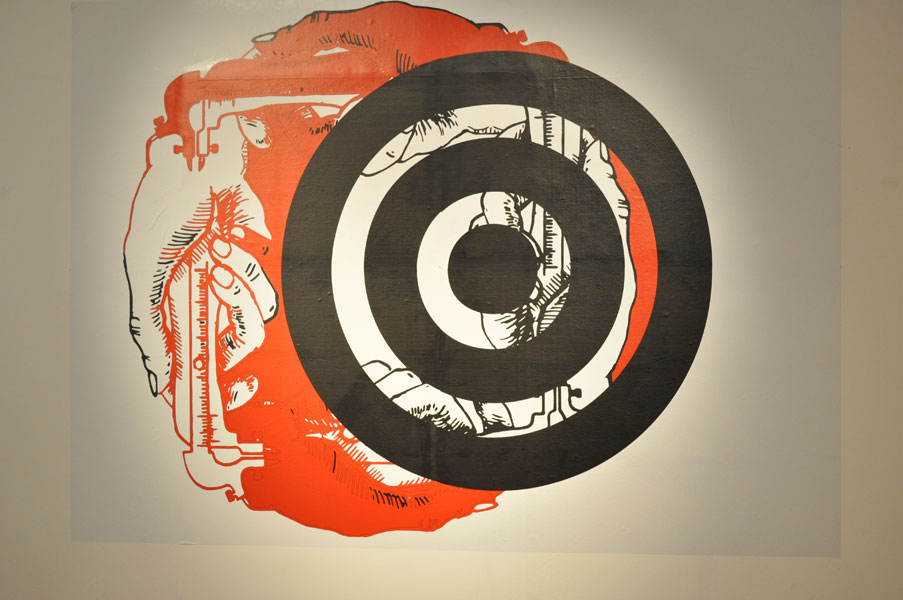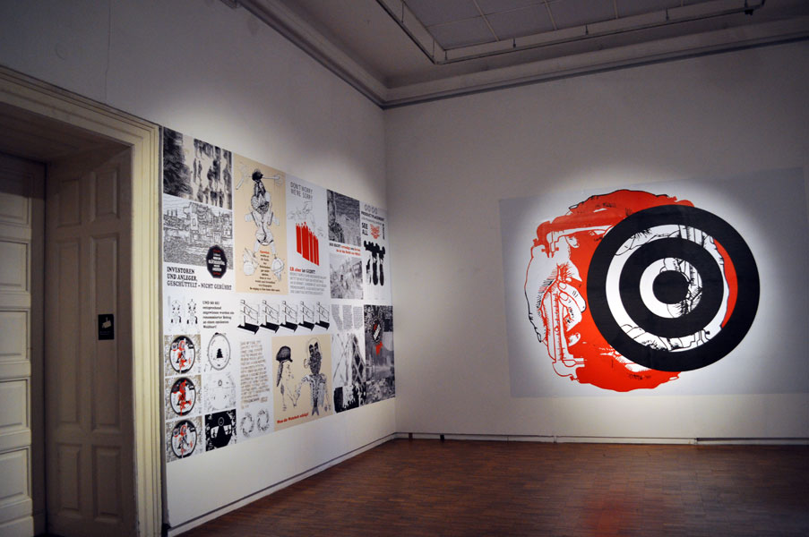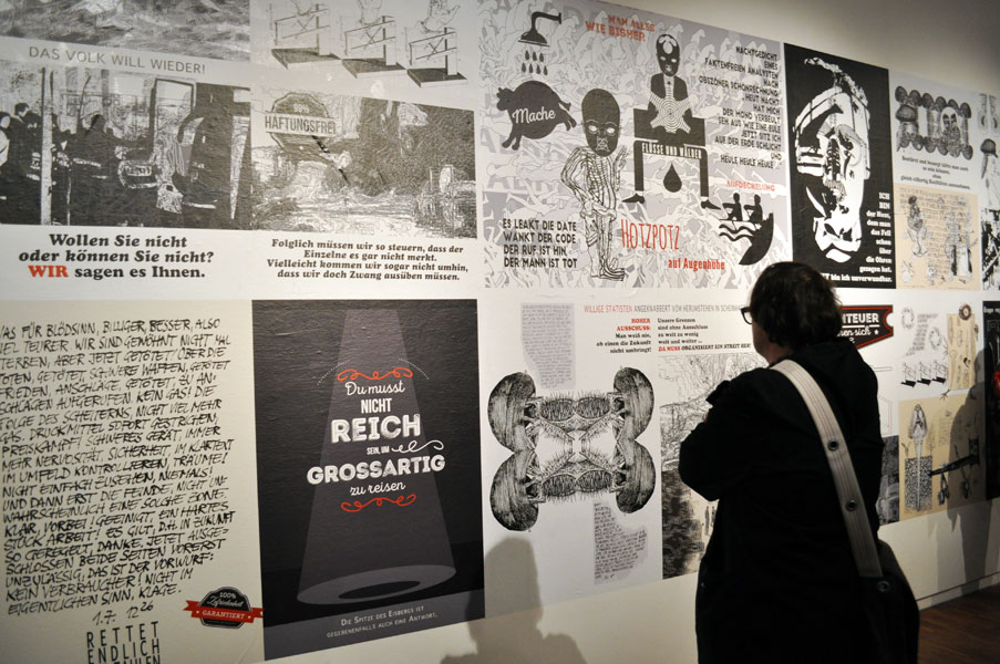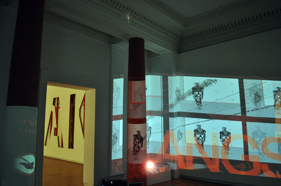 Heide Aufgewekt / Josef Danner / Georg Lebzelter nutzen massenmediale Textfragmente, Piktogramme und Bildcollagen als Ausgangsmaterial für eine kollaborative Wandarbeit, bei der es um vielfältige Neubestimmungen und Aufbrüche geht: um die Relation von Zeichen und Raum, um die Grenzen zwischen Bild und Schrift, um aktuelle gesellschaftspolitische Themen und poetische Zeichen. Dieser Aspekt der Grafik als Labor der Zeichensetzung ist sowohl eine Konstante in den Werken von Josef Danner und Georg Lebzelter, als auch in der Videoarbeit von Heide Aufgewekt.