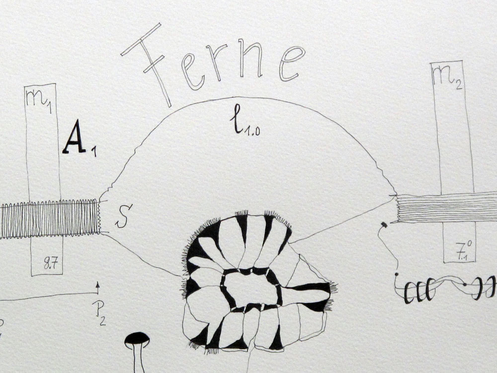 P { margin-bottom: 0.21cm; } Claudia-Maria Luenig, Weit-L.10, 2016, Zeichnungen, Drahtobjekte, Tuschstift auf Aquarellpapier, 180 x 85 cm (Ausschnitt)