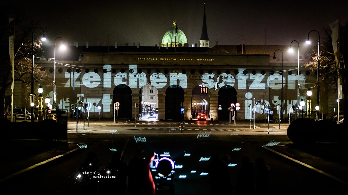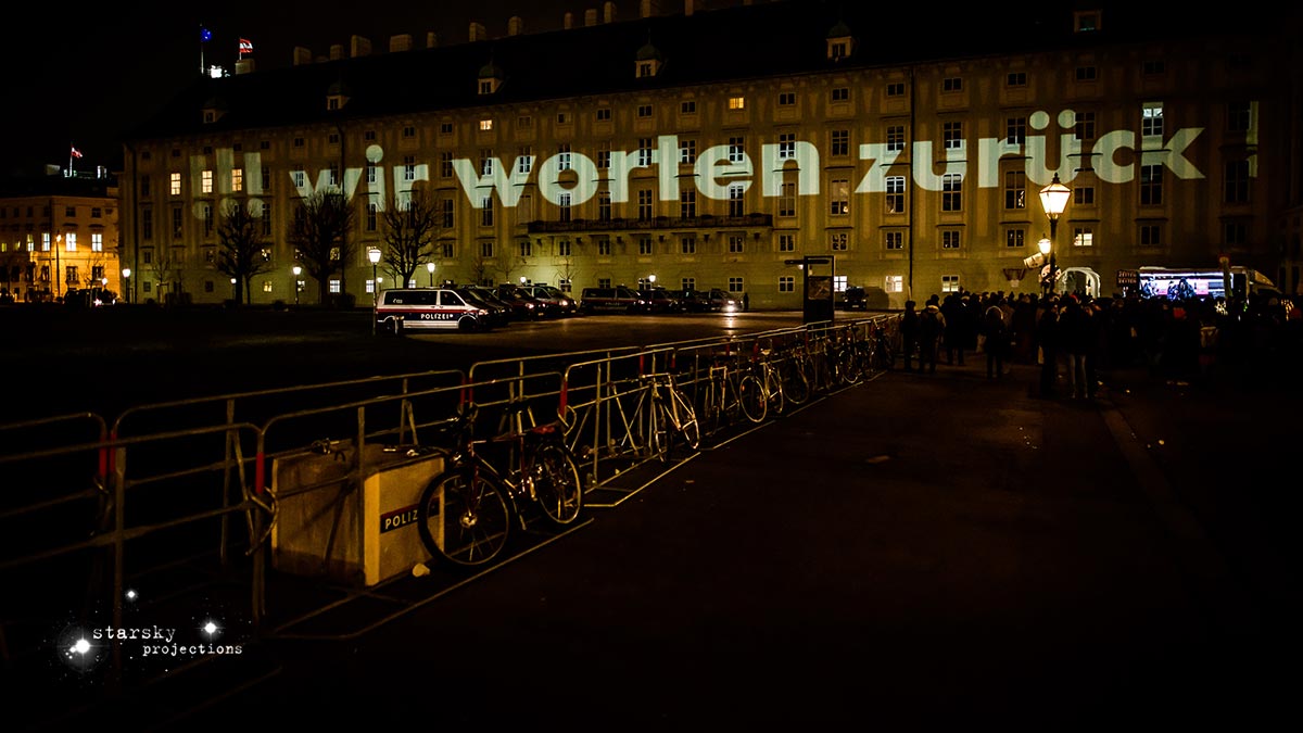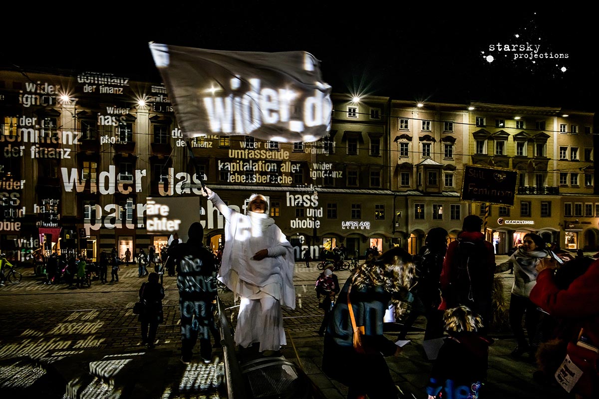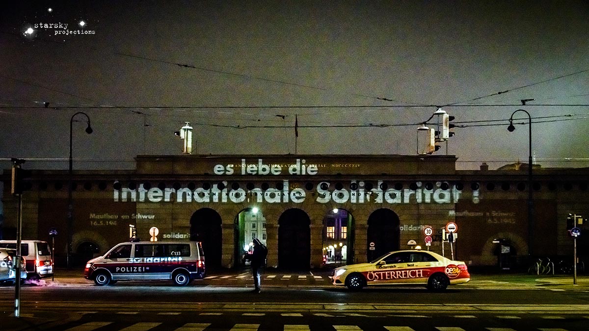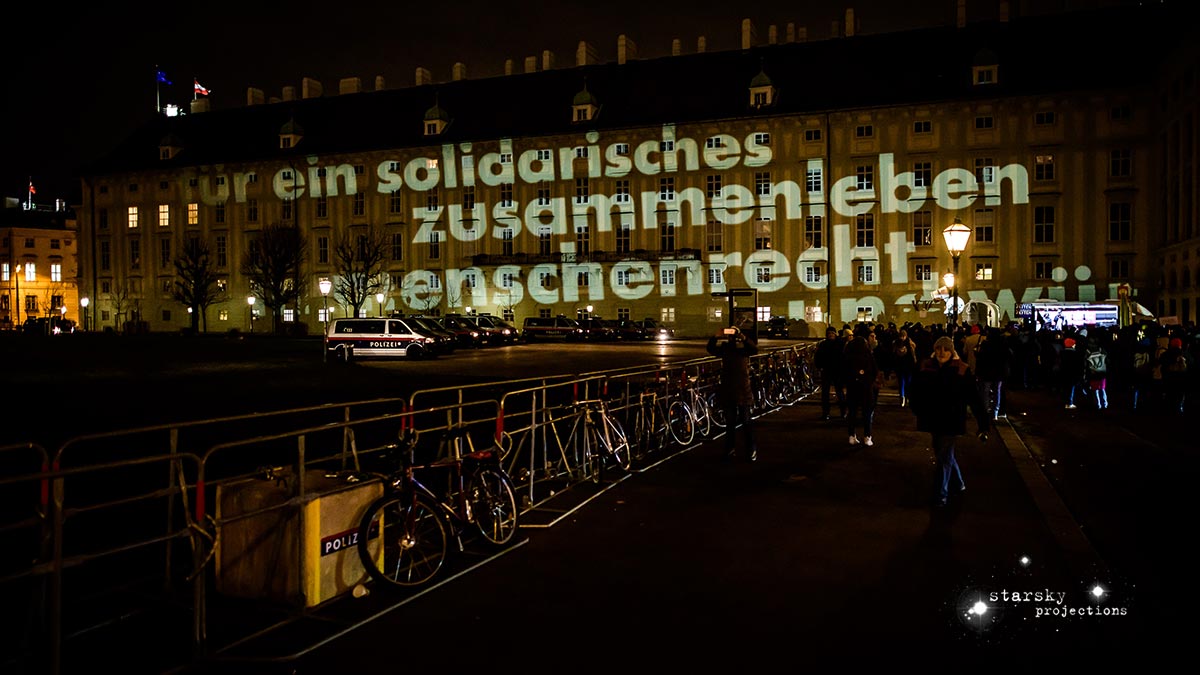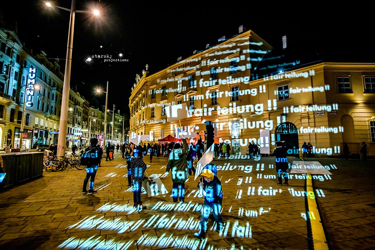 Beim Künstlerhaus 1050 beginnend, fährt ein Team, gefolgt von den Partizipator*innen, mit einem Projektionswagen zu neuralgischen Punkten in der Stadt, an die Orte der Macht und der Kapitalation, an die Stätten der Menschenrechte - Kapitalation, Migration und Staat sind die Zielpunkte der Interventionen. Die Route, die genauen Orte, stehen zu Arbeitsbeginn noch nicht fest, sondern werden der jeweiligen Situation und politischen Lage entsprechend im offenen Arbeitsprozess gemeinsam entwickelt und durchgeführt. Die Ergebnisse der Dokumentation werden schließlich in den Ausstellungsraum integriert.