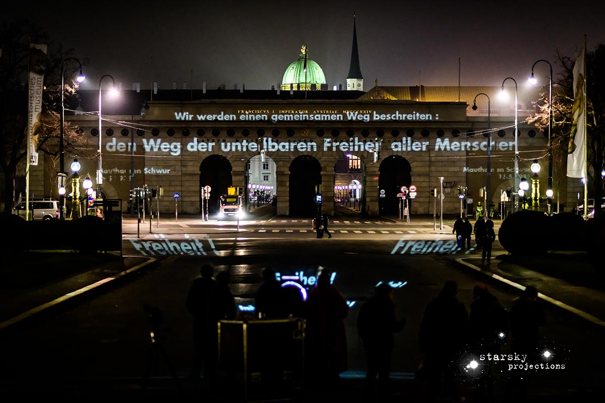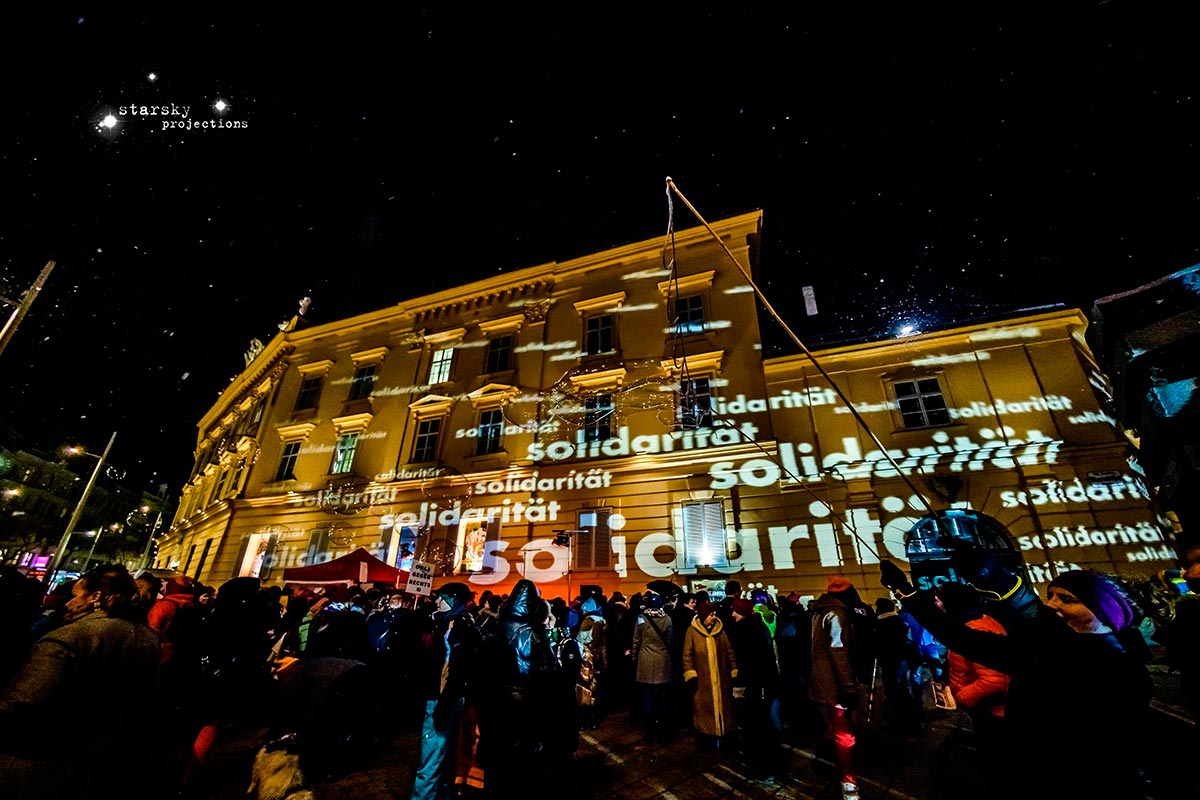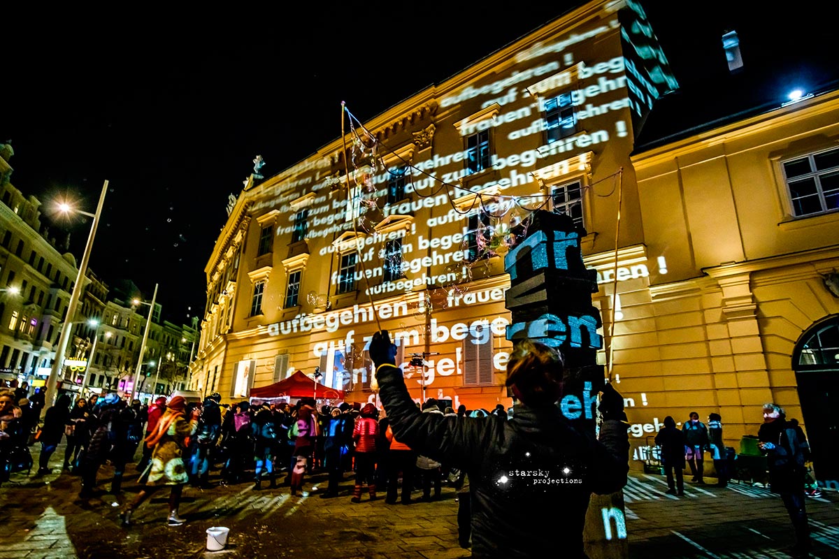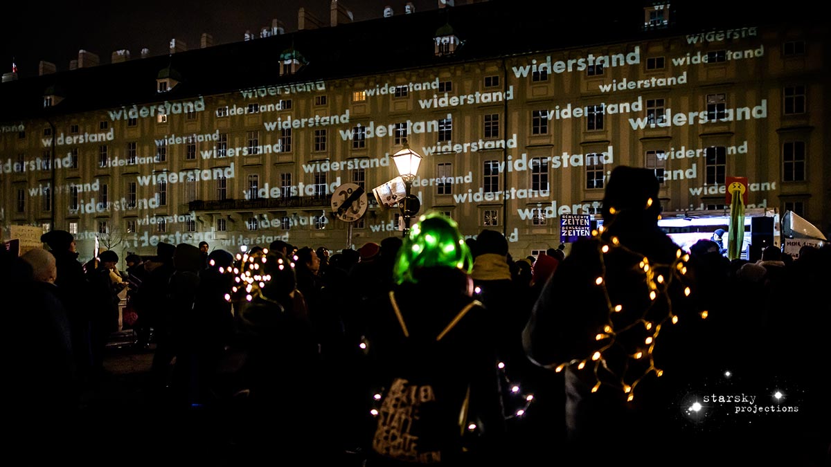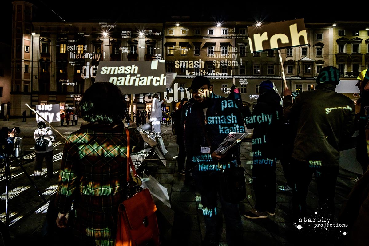 Beim Künstlerhaus 1050 beginnend, fährt ein Team, gefolgt von den Partizipator*innen, mit einem Projektionswagen zu neuralgischen Punkten in der Stadt, an die Orte der Macht und der Kapitalation, an die Stätten der Menschenrechte - Kapitalation, Migration und Staat sind die Zielpunkte der Interventionen. Die Route, die genauen Orte, stehen zu Arbeitsbeginn noch nicht fest, sondern werden der jeweiligen Situation und politischen Lage entsprechend im offenen Arbeitsprozess gemeinsam entwickelt und durchgeführt. Die Ergebnisse der Dokumentation werden schließlich in den Ausstellungsraum integriert.