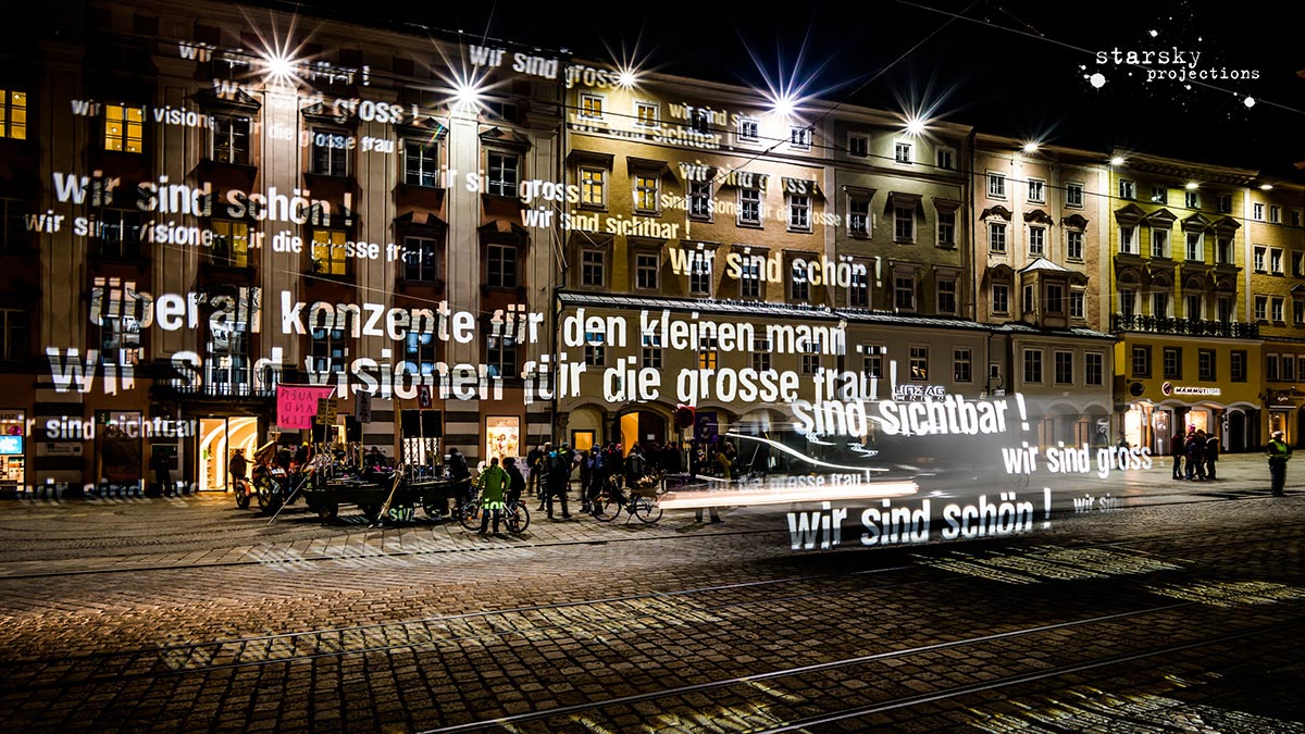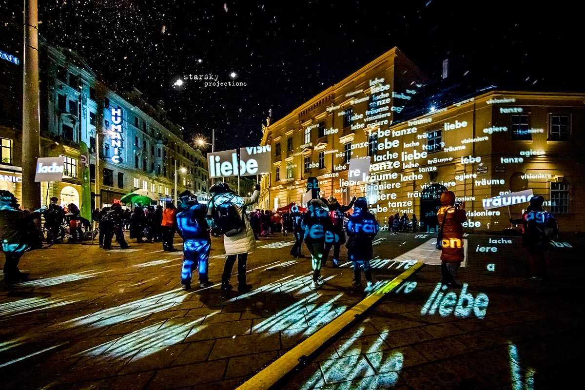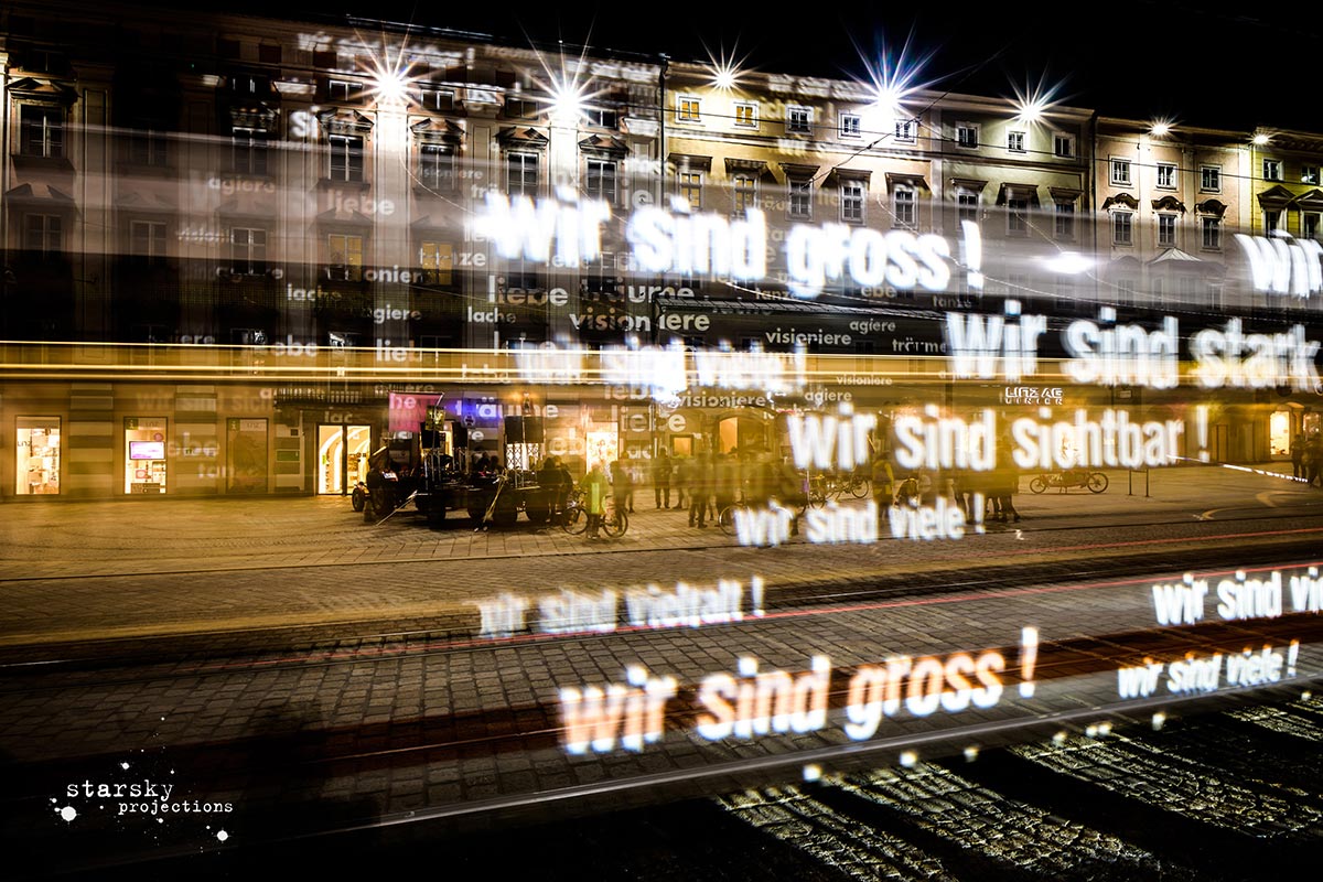 Höhepunkt dieses gemeinsamen Arbeitsprozesses ist eine fahrende Guerillaprojektion am 26. Mai 2018, ab 20.30 Uhr: flüchtige Texte aus Licht, die durch die Stadt ziehen, an ausgewählten Orten kurz halt machen, um in kurzen Pop-up Performances Texte auf Architektur, Objekten oder Körpern sichtbar zu machen und schnell wieder zu verschwinden.