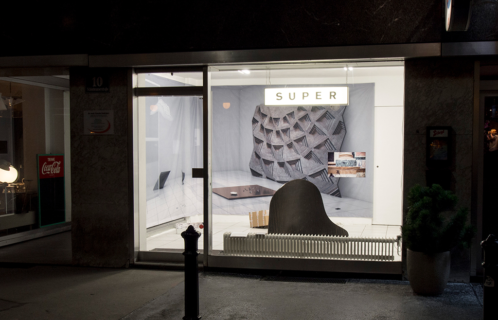 Der Zusammenbruch des Protokolls ist eine Kunstraum SUPER Ausstellung, die im Rahmen der Vienna Art Week an zwei Orten stattfindet. Entwickelt wurde diese gemeinsam mit den KünstlerInnen Bianca Pedrina und Markus Zeber. Erster Teil ist die Anordnung von skulpturalen Objekten, einer textiler Wandbehängung und fotografischen Applikationen im Kunstraum SUPER. Der zweite Teil ist ein virtuelles Raummodell, ein transkribiertes Abbild des Gefüges aus dem ersten Teil. Gezeigt wird dieses als übergroßer Digitaldruck im Künstlerhaus 1050. Es mit einem Auge fast eine Stunde lang aus der Nähe betrachten ist eine erdachte Ausstellungsansicht, die über etwas spricht das offenbar nicht da ist.