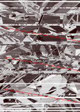 Wojciech Krzywobłockis großformatige und raumgreifende grafische Arbeiten gehen von Fotografien aus. Das Grundmaterial, das Krzywobłocki für seine Arbeit „Zwischen Rot und Weiß“ verwendet, hat er in einer zentralen Müllsammelstelle in Wien aufgenommen.