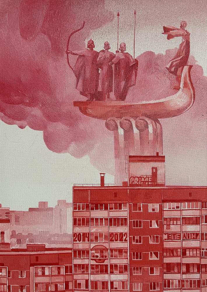 Having lived a year in the conditions of a great war, impossible not to compare life before and now. "The Kyiv landscapes” of Sergei Zapadnia and Denys Metelin also reflect the past and the present. The Zhitny Rinok is a place many love, a recognizable symbol of a peaceful, confident life in the capital. And" "Defenders of Kyiv" is today's landscape of the city, where Kyi, Shchek, Khoryv, and their sister Lybid, the founders of Kyiv, are represented as its defenders against the enemy against the background of the city in a red haze of anxiety.