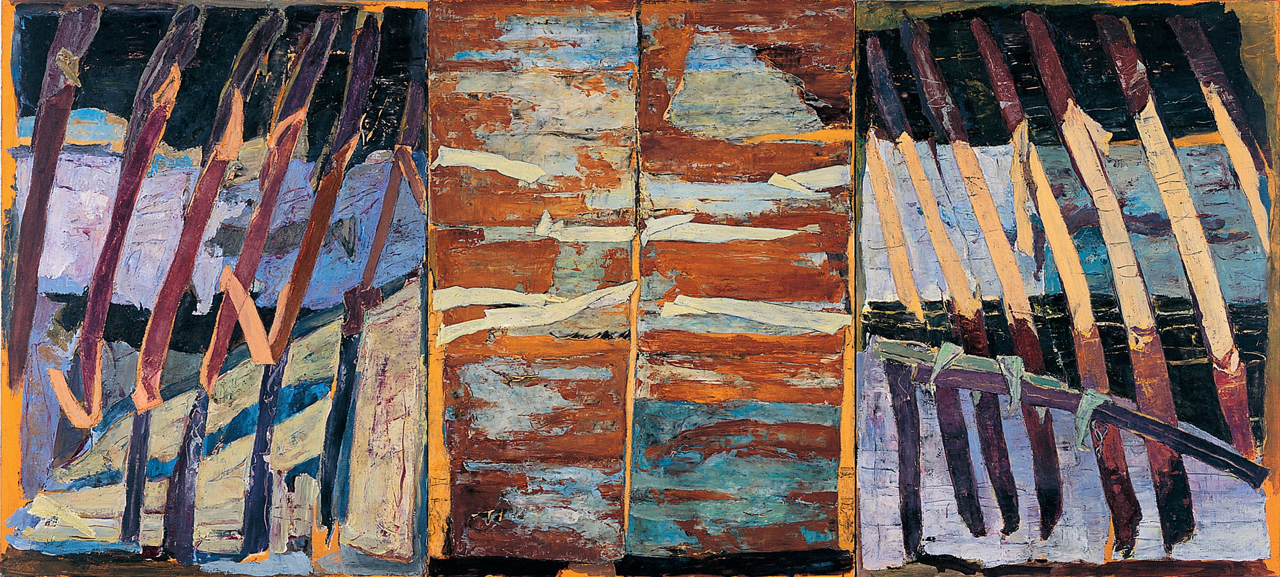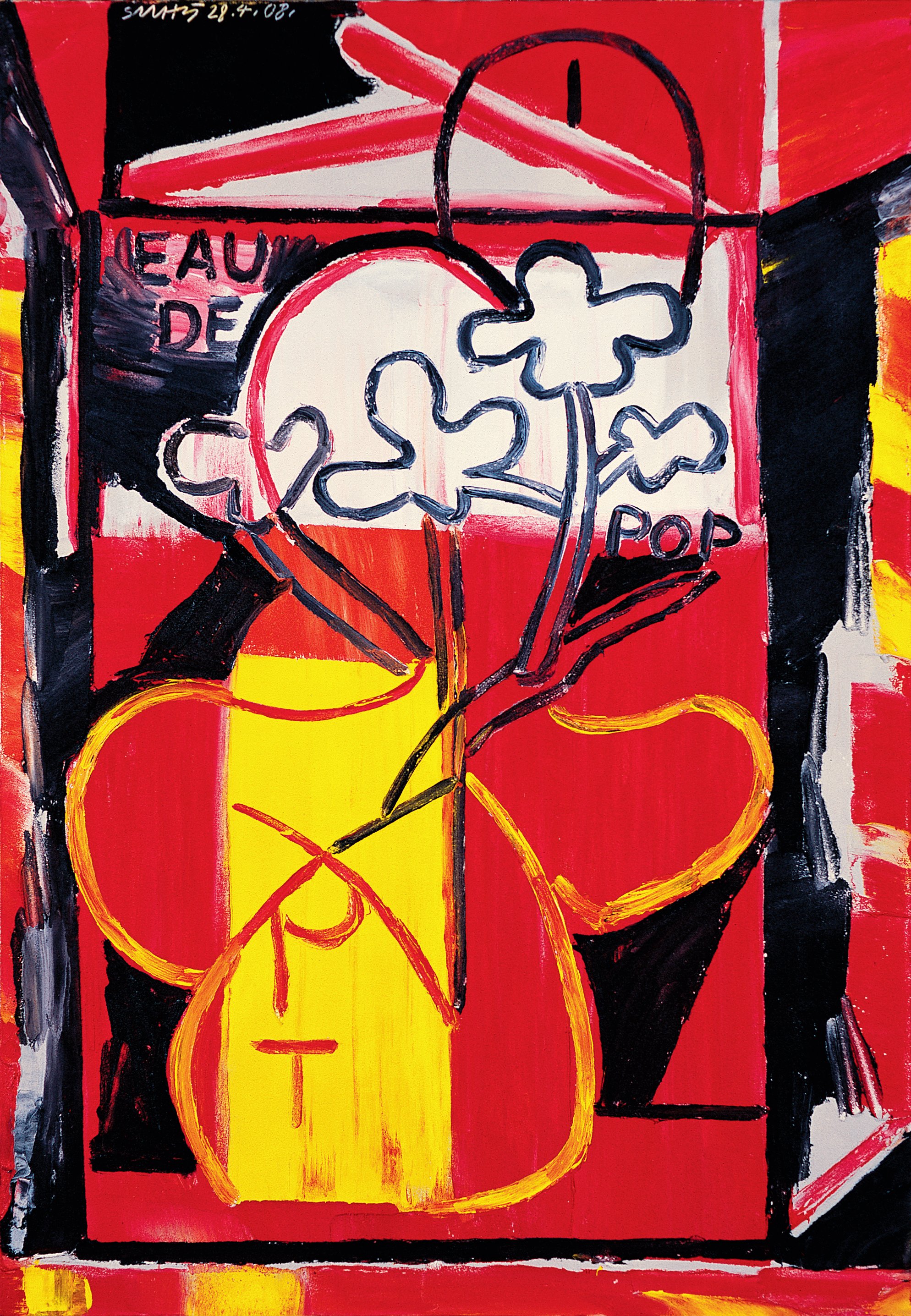 Emerik Bernard trat mit seinen koloristisch üppigen, abstrakten Kompositionen verhältnismäßig spät auf den Plan, Anfang der 80er-Jahre, doch erkannte ihn die Kritik ziemlich schnell als einen der bedeutendsten Vertreter des sog. New Image Painting, einer in der Malerei zutage tretenden Parallelentwicklung zur Architektur des Postmodernismus. Die hier ausgestellten Arbeiten sind im Laufe des letzten Jahrzehnts entstanden und zeugen mit unverminderter Intensität von der enormen, eruptiven koloristischen Kraft, die der Künstler mittels des klassischen Gemäldeformats des Rechtecks bändigt. Das Rechteckformat unterteilt er in der Form von Diptychen oder Triptychen, innerhalb deren wiederum mit mehr oder weniger klar nachvollziehbaren Versuchen die Bildfläche geometrisch rationalisiert werden soll.