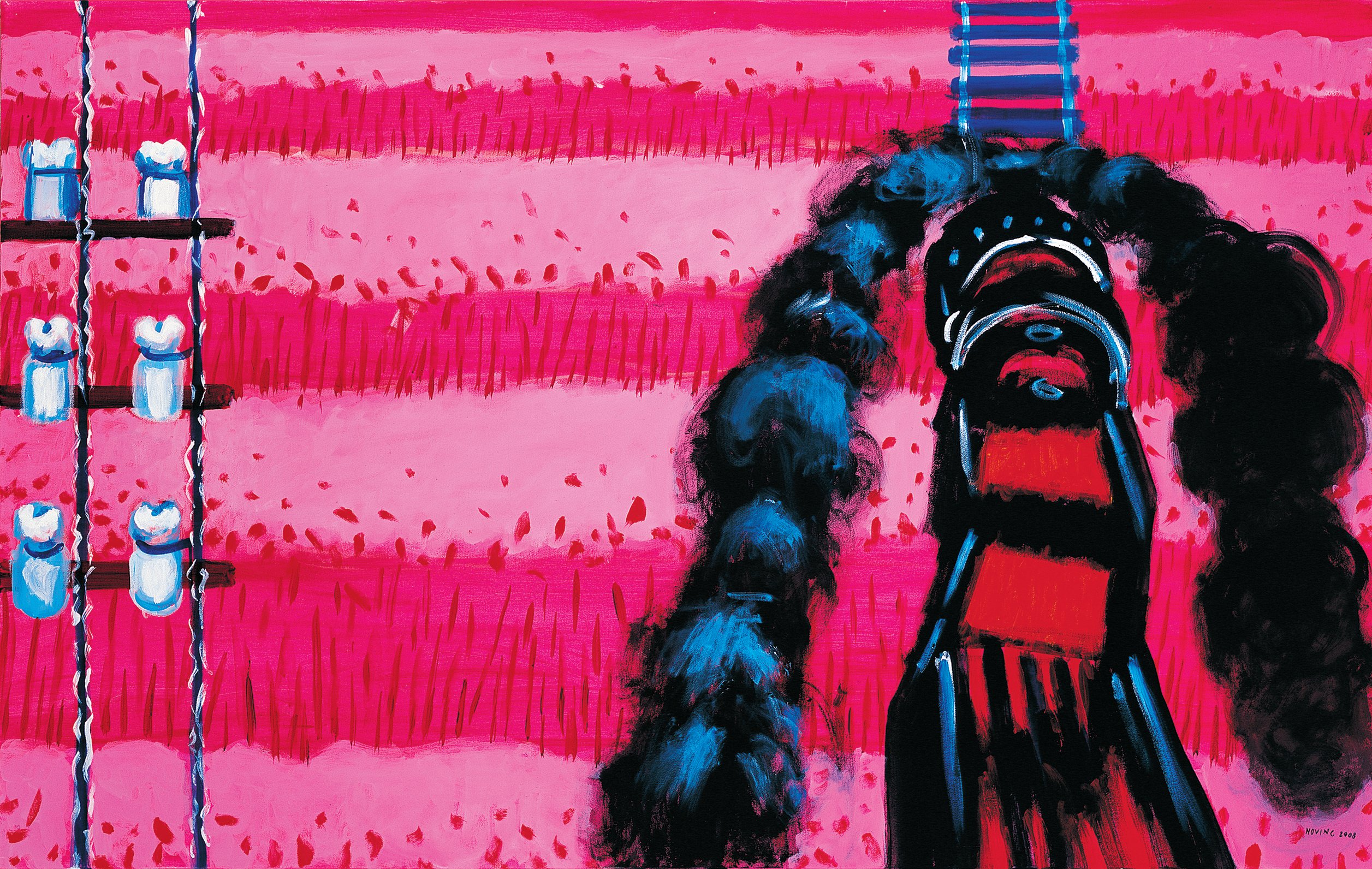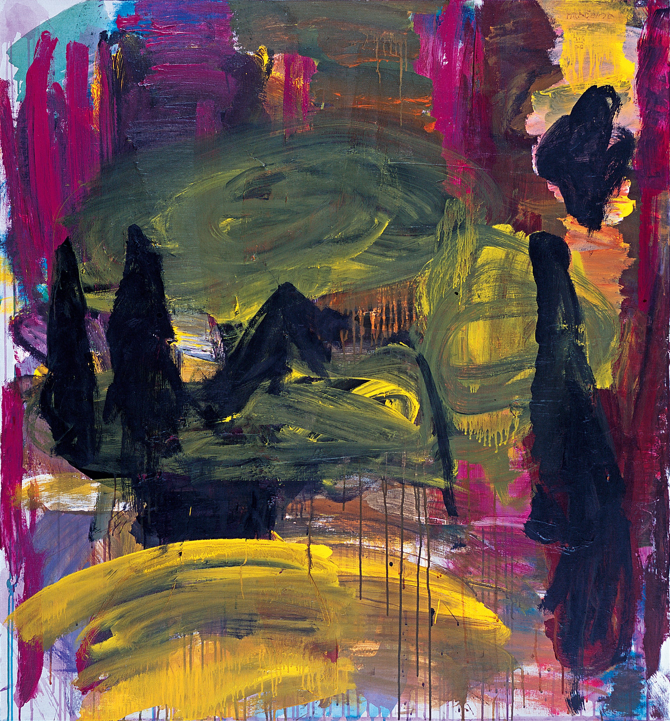 Einen starken Gegensatz zu den subtilen, in Form- und Farbgebung zurückhaltenden Arbeiten von Muhovič stellen die farben- und formreichen Bilder von Franc Novinc dar. Anfang der 70er-Jahre gesellte er sich, gemeinsam mit einer einflussreichen Gruppe von Kollegen, zu den Pionieren der so genannten expressiven Figurativmalerei. Von seinen anfänglichen, auf einige wenige Pinselstriche reduzierten und flächig wirkenden ,,Figuren“ wechselte er zu geradezu porträthaften, jedoch koloristisch intensiv umgestalteten Landschaften, in denen er mit einigen rationalen Einschnitten in Form technologischer Fremdkörper intervenierte. (...)