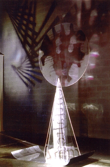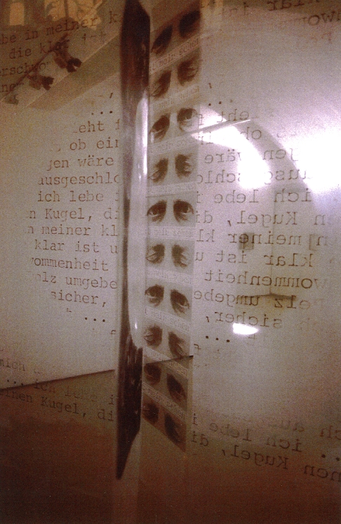 Die 1934 geborene Künstlerin lebt seit den 60er Jahren im Burgenland, in St. Margarethen, jetzt in Breitenbrunn. Sie zeigt ihre Arbeiten in Einzel- und Gruppenausstellungen im In- und Ausland seit den 6oer Jahren ,war an Kunstmessen und Symposien beteiligt. Sie erhielt den Burgenländischen Landeskulturpreis für Bildende Kunst und im Vorjahr den Kery Preis. Wenn Fria Elfen figurale Elemente in ihr bildliches Sprachrepertoire aufnimmt, handelt es sich um wenige, aber sehr sorgfältig und pointiertgewählte (photographische) Motive, die grundsätzliche, symbolhafte Urformen darstellen: der Baum, die Erdschollen, Wasser, das Fliessende, Pflanzen, das Gesicht – das eigene Gesicht. Diese tauchen in verschiedener Weise immer wieder in den Arbeiten auf. Der Vorrat figuraler Ausdrucksmittel ist bewusst begrenzt, die Überlegtheit der Verwendung tritt dadurch umso deutlicher zutage. Die strenge Wahl der Mittel kennzeichnet überhaupt das gesamte Werk. Die Farbpalette wird äußerst sparsam eingesetzt: schwarzweiss = monochrom, türkis, dann alle Mischtöne zwischen einem dunklen Blau und Orange. Jede kleine Einzelheit ist bedeutsam. (…) Gedankenverbindungen knüpfen. Das Schriftbild ist nicht immer klar, leicht lesbar – manchmal erscheint es verschwommen, leicht verwischt, überschnitten. Dies löst die Spannung des Erahnens aus, provoziert zum genauen Schauen. Das Schriftbild wird mit der Gesamtkomposition verwoben, man wird gezwungen, das Ganze zu erfassen und nicht nur den typographischen Teilbereich. Mit dem sprachlichen Inhalt ist es ähnlich wie mit den Bildgegenständen: Sie tragen grundsätzliche Bedeutung,sie sind thematisch eingegrenzt, sie sind reduziert, es geht nicht um eine flirrende, überreizte Vielfalt, sondern um die Entfaltung des für das menschliche Leben Wesentliche. (Eva Maltrovsky)