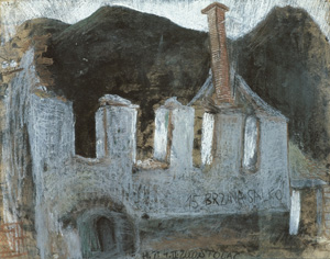 Halil Tikveša, Stolac – Haus des Salko Brzina, 2000, Mischtechnik auf Papier: Collage, Tusche, Kreide