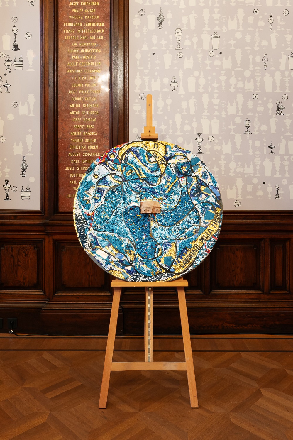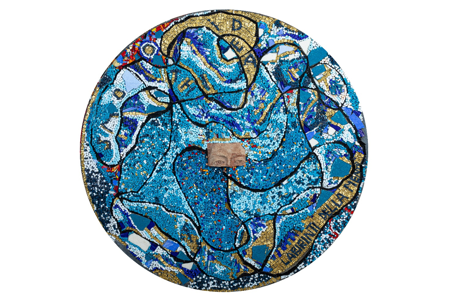 Nun beginnt die Reise, die die Besucher*innen zu einer Wiedergeburt führt: Indem sie dem Verlauf der Mosaiksteine und damit den Noten, also den Emotionen und Stimmungen, folgen, gelangen sie zum letzten Werk: Labyrinthe des Geistes präsentiert mehr und lebendigere Farben, weil dafür goldene und silberne Mosaiksteine aus der Manufaktur Orsoni und venezianische Glasmosaiksteine in verschiedenen Blautönen verwendet wurden. Die aus Terrakotta geformte Augenpartie in der Mitte lädt die Besucher*innen dazu ein, nach innen zu blicken und sich auf den verschlungenen Wegen des eigenen Geistes zu verlieren. Das Werk fordert aber nicht nur zur Selbstbeobachtung auf, sondern veranschaulicht auch den kreativen Prozess, der zu seiner Herstellung geführt hat.