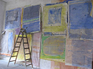 Der in leisen Tönen gehaltene Farbauftrag, den Christoph Luger auf der Leiter ste- hend vornimmt, beinhaltet gleichermaßen großflächige Malerei und feine Zeichnung. Ausgangspunkt für die Bildidee sind oft an real existierenden Dingen vorgefundene Formen, die im Laufe des Malvor-ganges in nicht-gegenständliche Strukturen transformiert werden. Beim Abnehmen des Papiers wird die Wandmalerei zum Bild, auf dem die Spuren des Entstehungsprozesses – auch Risse oder Knitter