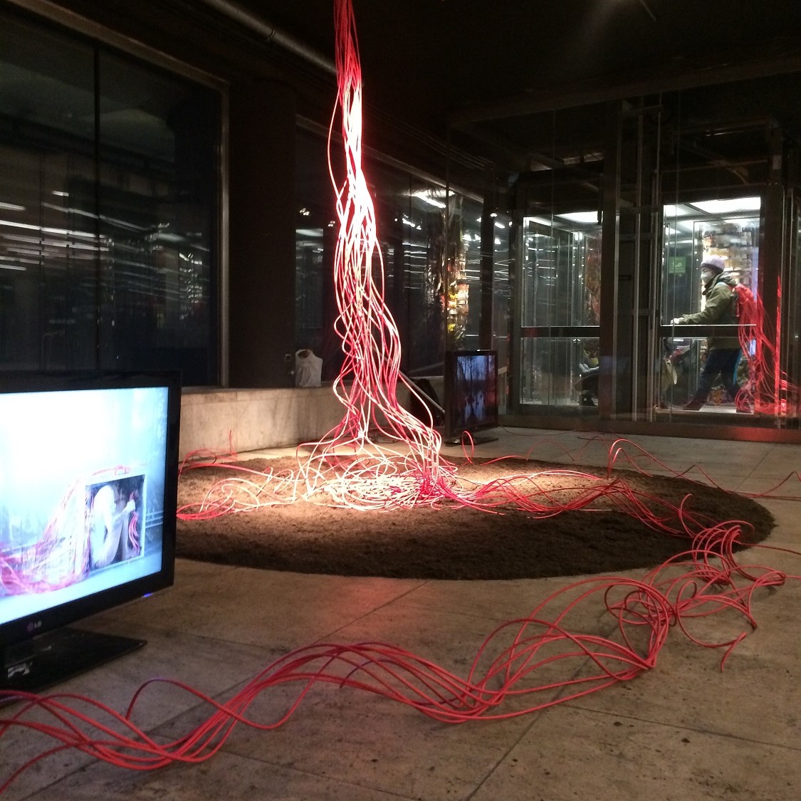 Roberta Limas Installation Ghost Plant – aktuell zu sehen, als Teil der Ausstellung aber auch in der Karlsplatz Passage im Red Carpet Showroom - thematisiert Unterstützungs- und Vernetzungssysteme, wie wir sie in den unglaublichen Strukturen der Natur und unserer Umwelt vorfinden. Um Licht konkurrierend profitieren Waldbäume verschiedener Arten voneinander, wenn sie sich einen Raum teilen. Ihre Wurzeln sind miteinander verflochten und ihre symbiotische Beziehung zu Pilzen schafft eine unterirdische Ökonomie, ein riesiges Netzwerk, das „The Wood Wide Web“ genannt wird. So steht in Ghost Plant der Körper für sich allein, das Kollektiv für Empowerment.
