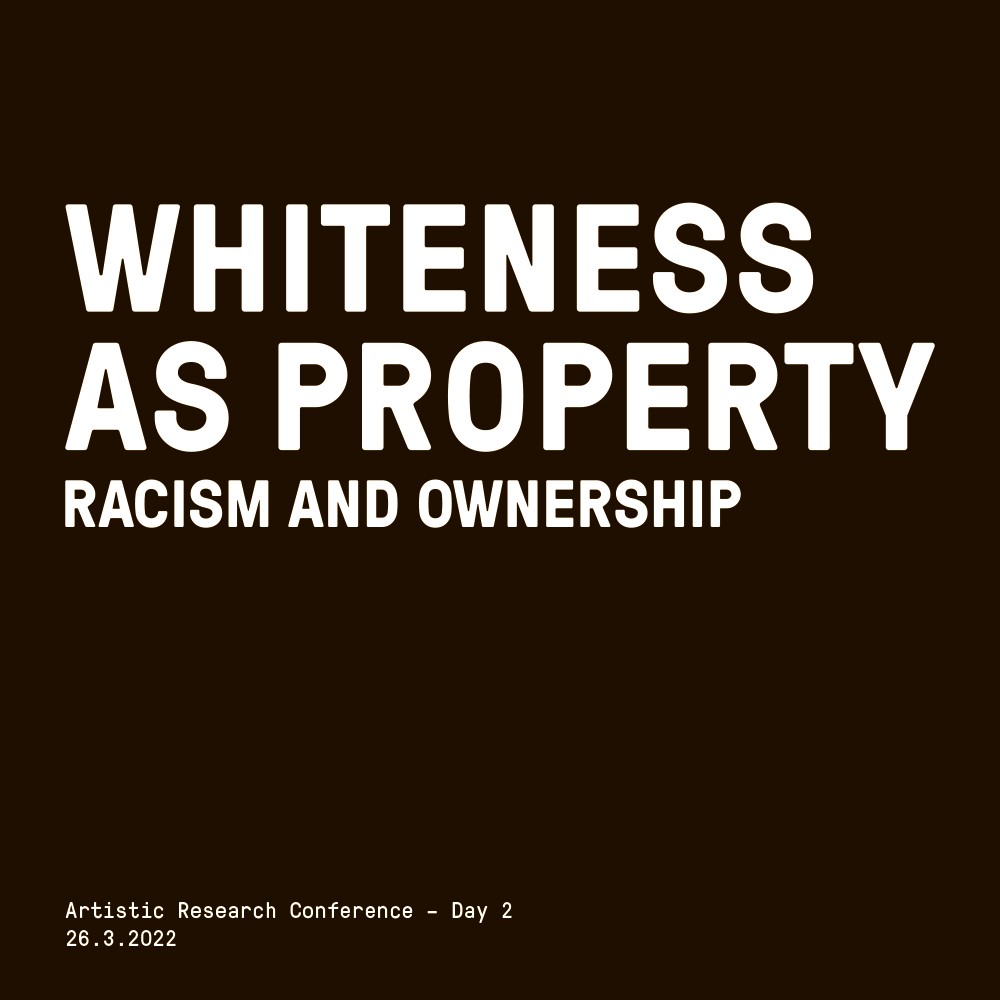 The conference accompanying the exhibition WHITENESS AS PROPERTY is dedicated to the specific knowledge of the participating artists. As a conference of artistic research, the event provides an opportunity for an in-depth exploration of possessive individualism and racialized property relations from the perspective of aesthetic production. For two consecutive days, the artists will present and discuss their practices with the audience.