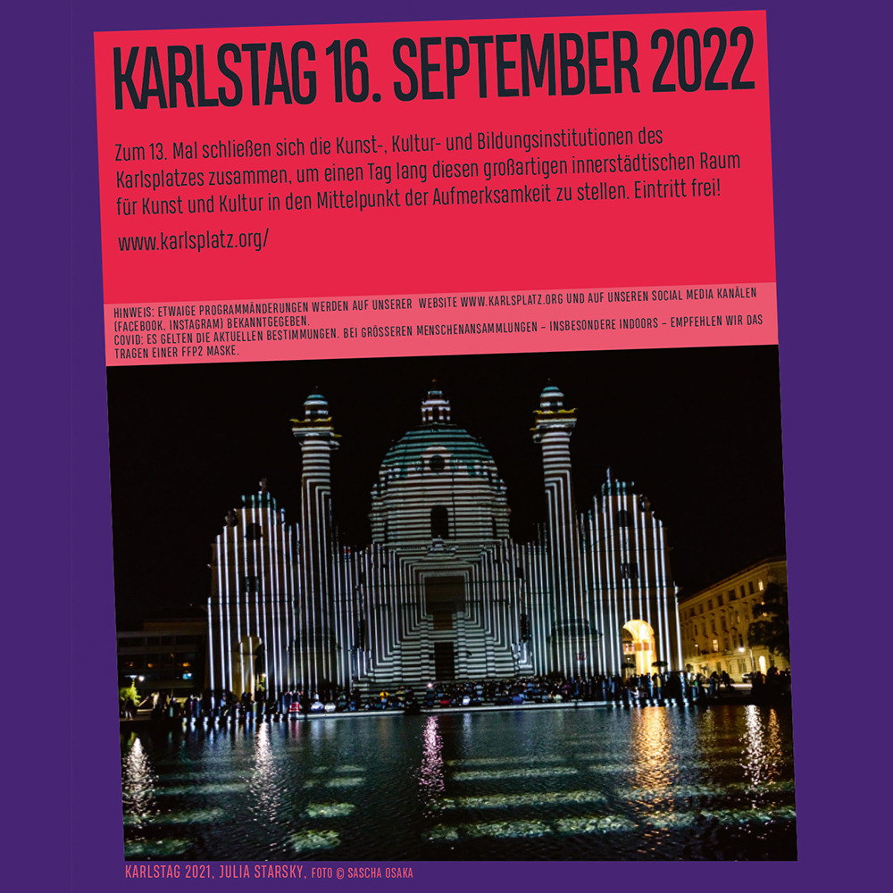 Zum 13. Mal schließen sich die Kunst-, Kultur- und Bildungsinstitutionen des Karlsplatzes zusammen, um einen Tag lang diesen großartigen innerstädtischen Raum für Kunst und Kultur in den Mittelpunkt der Aufmerksamkeit zu stellen. Eintritt frei!!