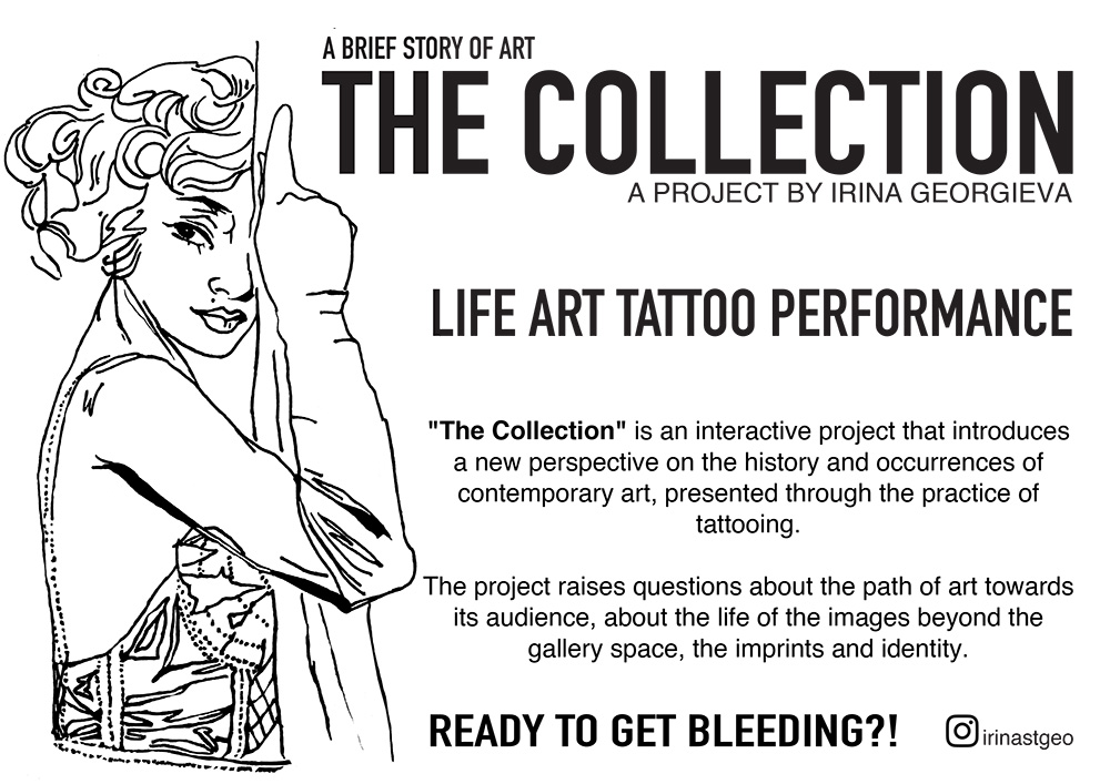 "The Collection" wirft Fragen zum Weg der Kunst zu ihrem Publikum auf, zum Leben der Bilder außerhalb des Galerieraums und zur universellen Sprache der Kunst. In einer Zeit, in der alles personifiziert ist, bietet das Projekt einen Weg für eine persönliche Interpretation der Kunst durch das Symbol der Identität, das Tätowieren. Indem ich Kunstwerke in ein Tattoo umwandle, schaffe ich praktisch eine große, endlose Sammlung – besser gesagt, hunderte von Sammlern und ihren persönlichen Kunstsammlungen. "The Collection" bietet einen innovativen Blick auf die Welt der großen und oft entfernten Kunst. In dieser Herangehensweise an das Thema öffnet sich eine tiefe demokratische Dimension und der Versuch, Kunst in den Besitz jedes Einzelnen zu bringen und sie allgemein zugänglich zu machen.
