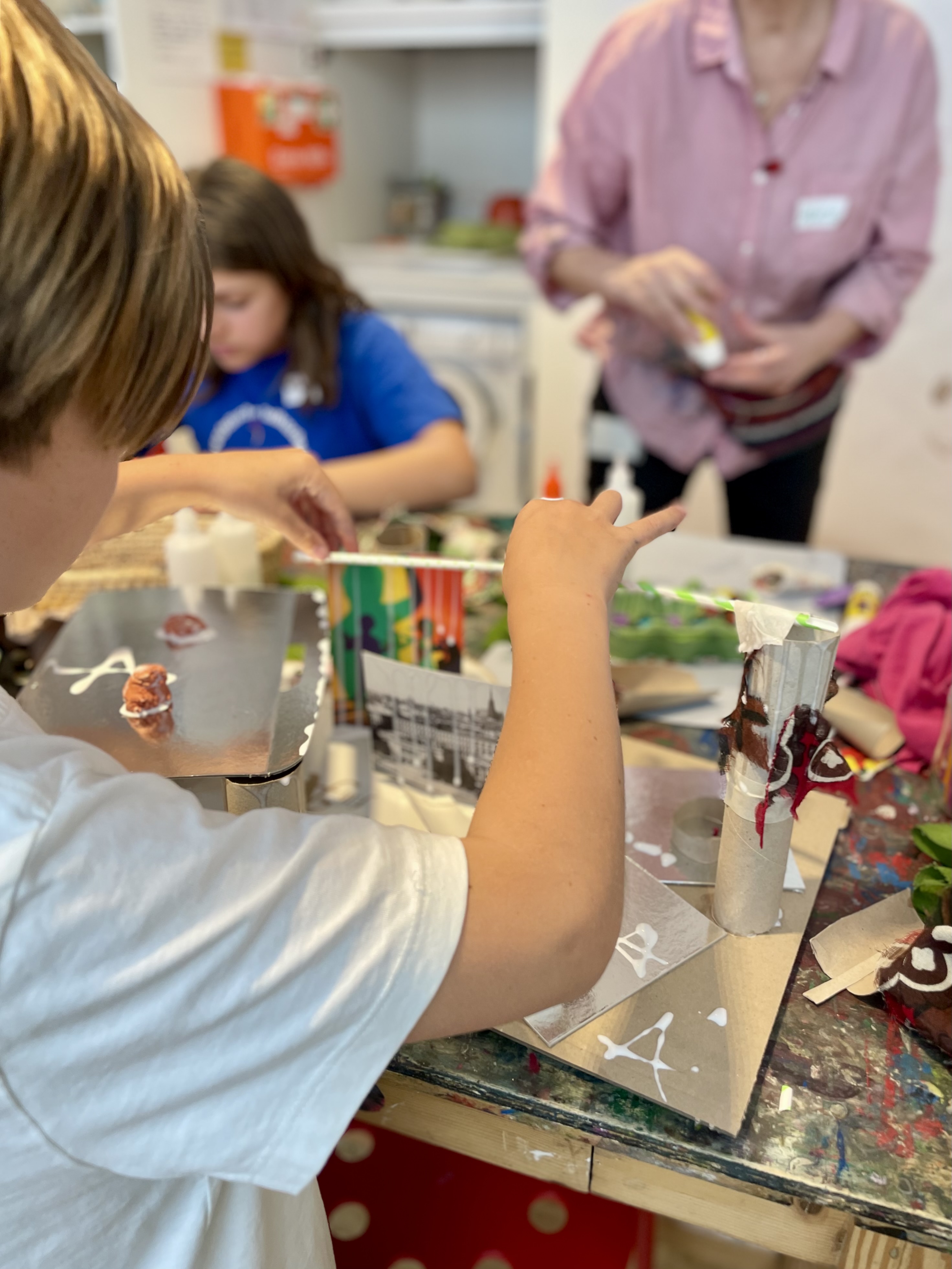 Stell dir vor du könntest in eine Ausstellung gehen, in der man nicht nur schauen, sondern auch die Kunstwerke angreifen darf! Bei unserer Ausstellung IMAGINING PIECE geht es ganz viel um Vorstellungskraft und ums Mitmachen. Wir hinterlassen Spuren im Sand, tanzen als Schattenfiguren durch den Raum und denken uns fantasievolle Geschichten aus. Jeden Tag lernen wir neue Kunstwerke kennen, zu denen wir eigene Kreationen gestalten.