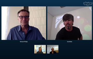 gleichzeitig in Wien (Galerie, Künstlerhaus) und North Carolina (Night Gallery, Winston-Salem NC 2710, USA) anwesend und spielen mittels Skype Connection das CARD GAME - BURNING ISSUES auf vier Computern.