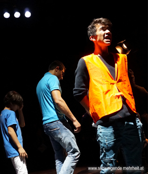 "Schutzbefohlene performen Jelineks Schutzbefohlene“ ist der Titel eines Theaterabends, den die schweigende Mehrheit mit FreundInnen, die sie in Traiskirchen kennengelernt haben, gemeinsam erarbeitet. Ein Theaterabend, der sich laufend weiter entwickelt - so wie die Geschehnisse in Österreich, die die Rahmenhandlung bilden. Während der Proben wird immer wieder am Text gearbeitet, so wie auch Elfriede Jelinek weiterhin an ihrem Text "Die Schutzbefohlenen" fortschreibt.