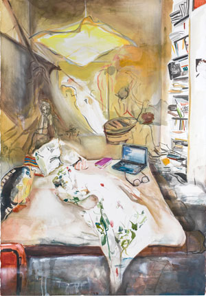 Franzobel schreibt im Bett. Der Malerin Anke Armandi bot er großzügig einen unverstellten Einblick in seine Schlafnische, in der er seine Ideen für seine zahlreichen Romane, Erzählungen und Theaterstücke zur Entfaltung bringt. Aus dieser Begegnung malte Armandi den Ort der Inspiration für seinen 2017 erschienenen Roman