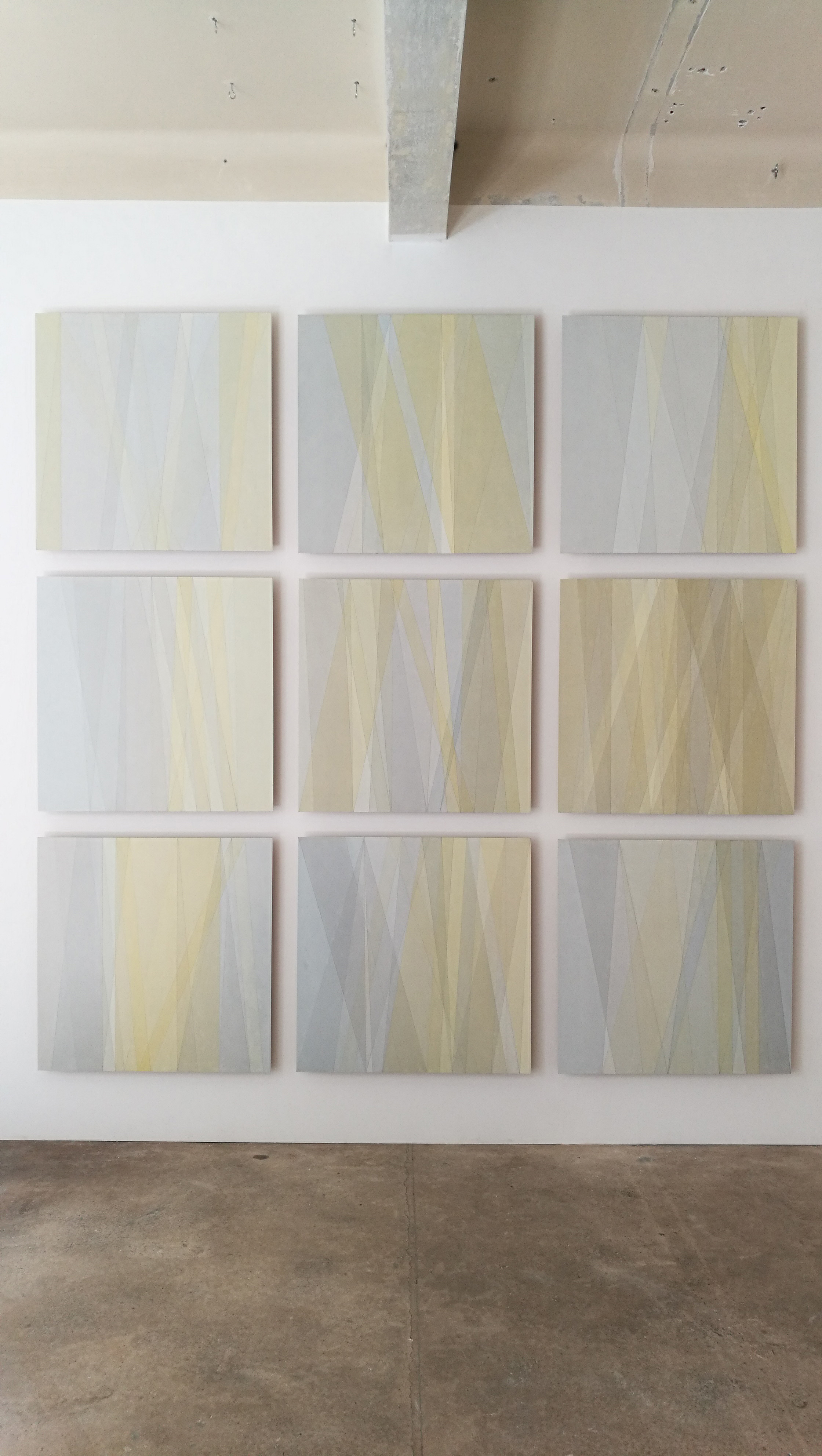 Fritz Ruprechter zeigt neun Bilder aus einer Serie von 18 Strukturbildern „Gelb-Grau“ von 2015, deren imaginative Raumerfahrungen der Tiroler Künstlerin Anna-Maria Bogner als Inspiration für eine Linien-Installation durch den Ausstellungsraum dienten.