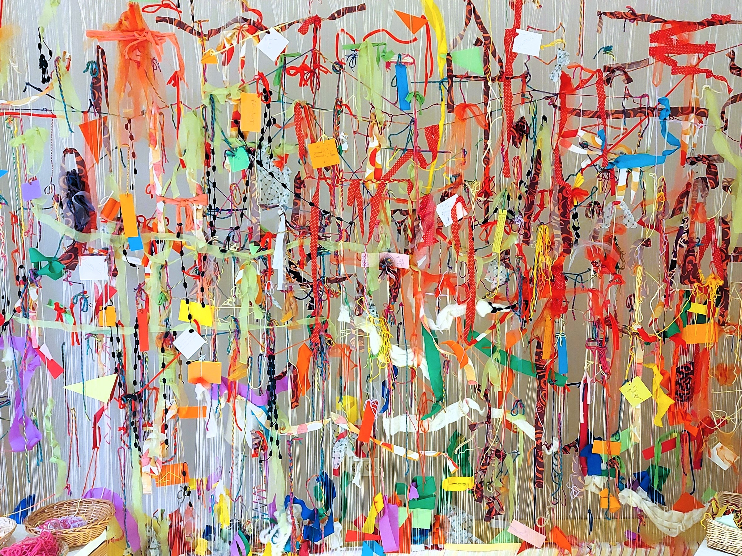 Der Raum lädt zum Innehalten ein, nach oder während dem Besuch der Ausstellung. Entdeckt verschiedene Materialien, lasst euch inspirieren und werdet selbst aktiv, schafft etwas Eigenes mit euren Händen. Die Eindrücke und Bilder, die während dem Ausstellungsbesuch auftauchen, könnt ihr hier festhalten. So entsteht über die Dauer der Ausstellung ein Gesamtkunstwerk aller Besucher*innen – jede/r arbeitet für sich und doch gemeinsam.