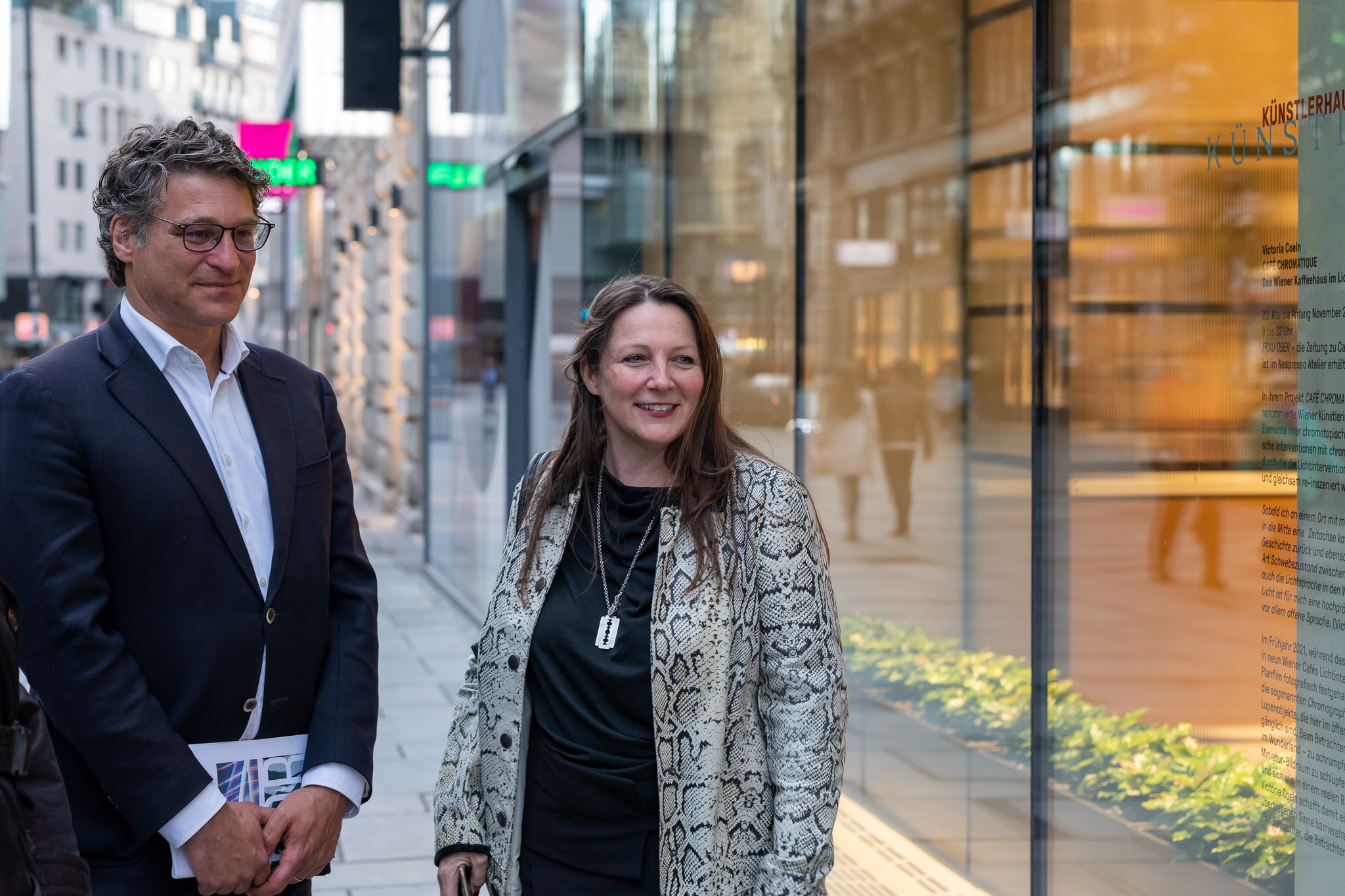 © Helmut Prochart - Tanja Prušnik (Präsidentin der Künstlerhaus Vereinigung) und Alesandro Piccinnini (Geschäftsführer Nespresso Österreich) vor dem Kunstschaufenster im Nespresso Atelier, 2021