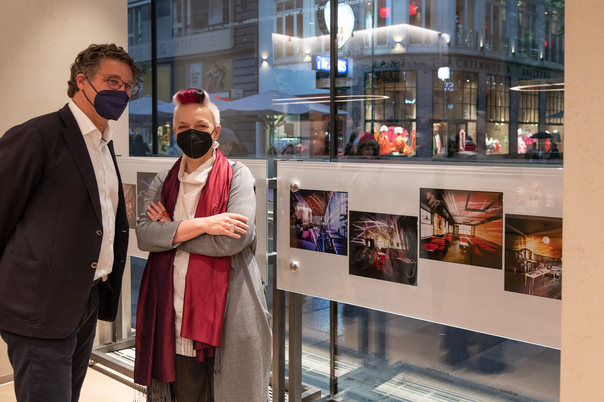 © Helmut Prochart - Victoria Coeln (Licht- und Medienkünstlerin) und Alesandro Piccinnini (Geschäftsführer Nespresso Österreich) vor der Installation CAFÉ CHROMATIQUE im Nespresso Atelier, 2021.