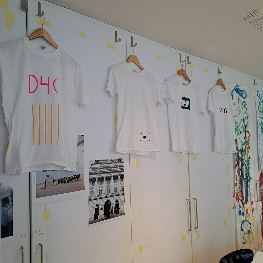 Beim zweiten Termin kam das gewonnene Wissen bei der Gestaltung ihrer T-Shirts zum Einsatz. Die Teilnehmer*innen konnten ihre bereits vorhandenen Schablonen nehmen oder nach Wunsch neue gestalten. Die fertigen Kompositionen wurden schließlich auf weiße T-Shirts gedruckt. Die Ergebnisse variierten von wilden Mustern bis hin zu minimalistischen Designs.