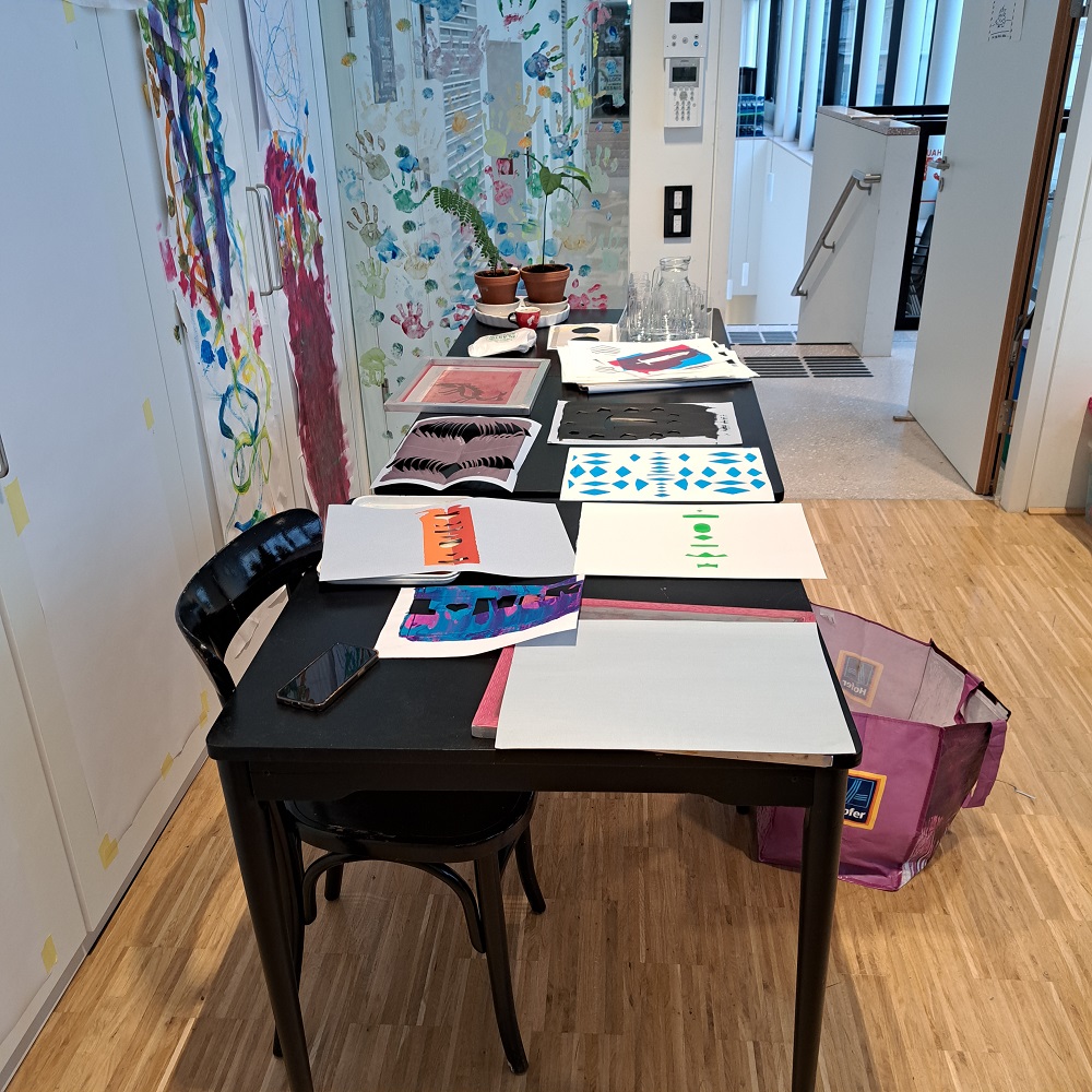 Der Siebdruck-Workshop wurde von den Kulturvermittler*innen des Künstlerhauses geleitet und fand an zwei Terminen statt. Dadurch hatten die Jugendlichen genügend Zeit, beim ersten Termin das Künstlerhaus als Institution sowie die Siebdruck–Technik kennenzulernen. Zuerst konnten sich die Teilnehmer*innen selbst im Gestalten von Schablonen ausprobieren.