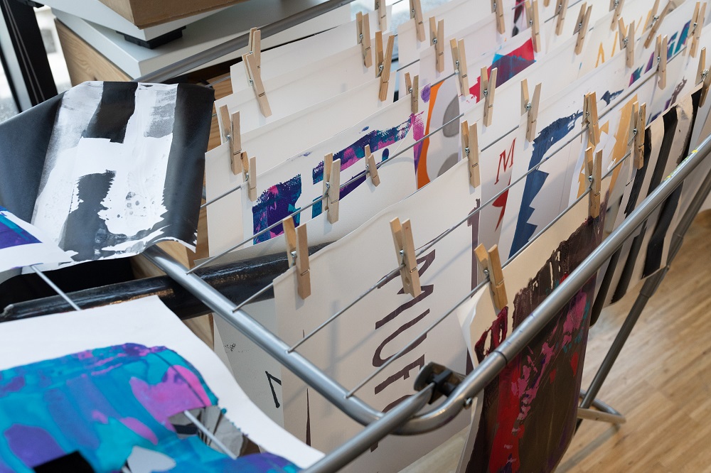 Dabei ging es um das aktive Ausprobieren – was muss man bei den Schablonen beachten, welche Farben harmonieren zusammen, welche Muster funktionieren nicht so gut? Ihre Kompositionen wurden anschließend auf Papier gedruckt.